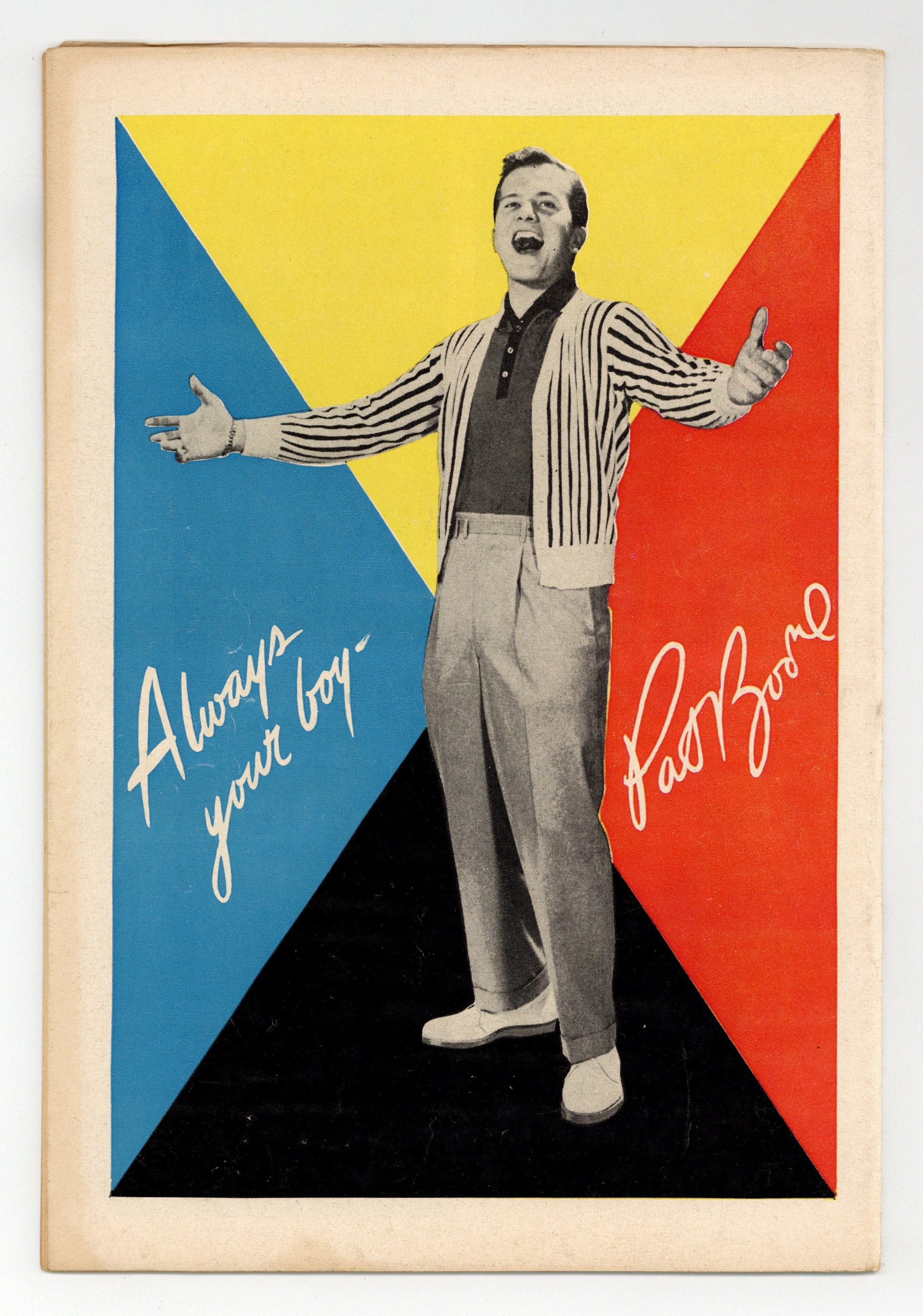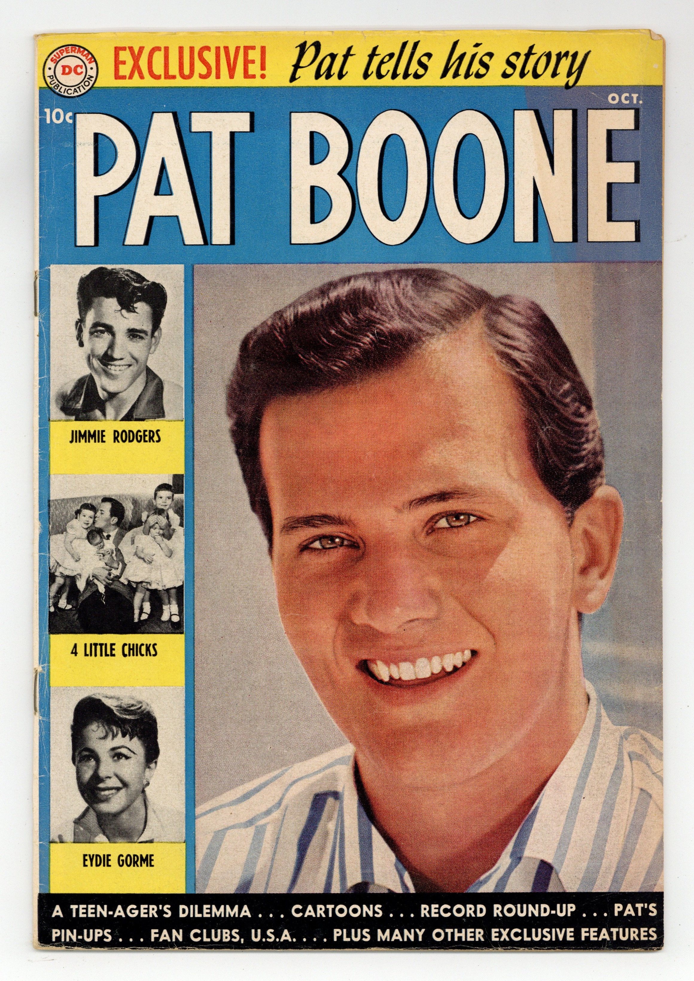 Photo cover of Pat Boone, Jimmie Rodgers, 4 Little Chicks, and Eydie Gorme. A letter from Pat Boone with black & white photo on inside front cover. "The Pat Boone Story: The Beginning Years" article by Pat Boone. Jimmie Rodgers bio. "A Teen-Ager's Dilemma!", script by Larry Nadle, art by Bob Oksner; Lynn wants to go see Pat Boone at the state fair and wants her guy Ken to ask her; Carol wants Ken to ask her; Lynn's so upset she doesn't want to see Ken, so Bette makes up a story that she's gone to audition to sing with Pat Boone. Pat's Pin-Ups. Teen's Eye View gags by Mort Drucker. Eydie Gorme bio. "4 Little Chicks," script by Larry Nadle, art by Bob Oksner; The Boones have babysitter problems. Pat Boone photo on back cover. 36 pgs., full color. Cover price $0.10.