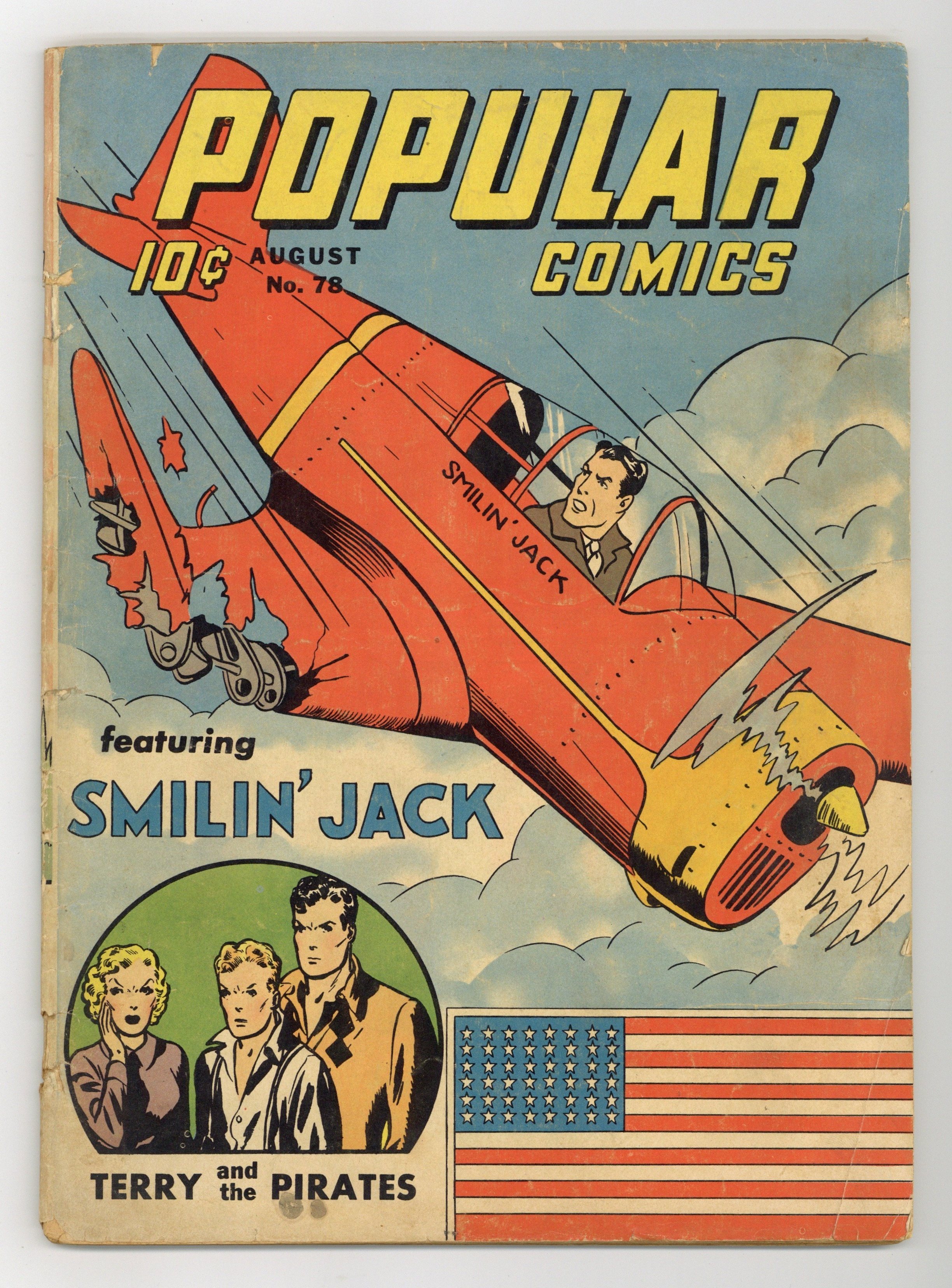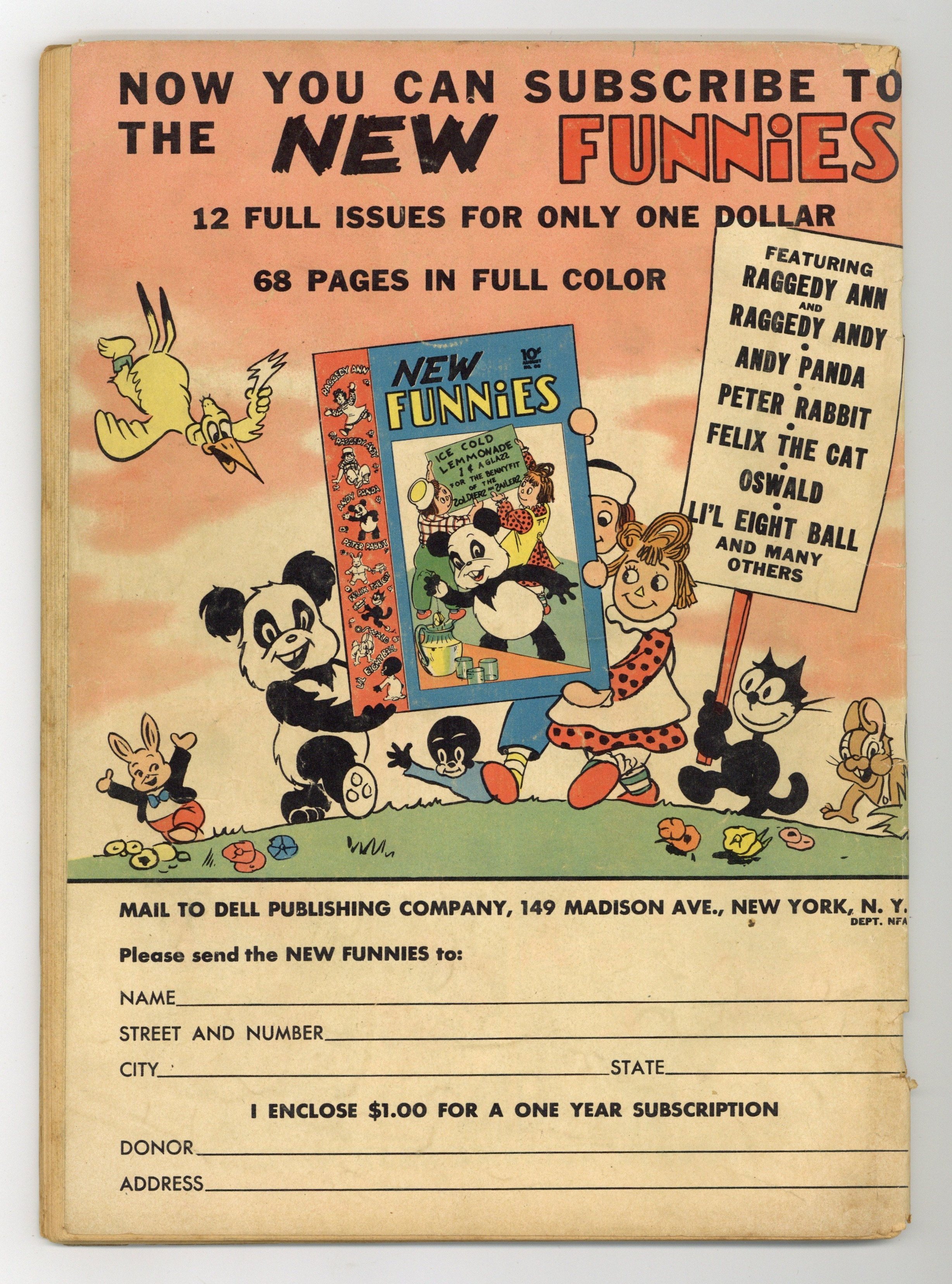 Stories and art by Milton Caniff, Bill Holman, Frank King, Zack Mosley, Boody Rogers, Frank Thomas, George Lichty, Bob Jenney, Jack Ficklen, Gaylord Du Bois, John Hampton, Hal Bittner, Frank V. Martinek, Leon A. Beroth, Albert Hartje and Bill Ely. An early comic book from Dell, featuring reprinted newspaper comic strips alongside new material. Captain Midnight manages to convince the local sheriff that he's on the side of justice, but he loses his prisoner in the process. Smilin' Jack escapes from prison again, this time without the gang leader called The Head. The Owl investigates a mysterious new neighbor and learns he's an escaped Nazi war criminal. Also featuring popular strips Terry and the Pirates, Smokey Stover and Gasoline Alley. Grin and Bear It; Smilin' Jack; Terry and the Pirates; Storm Pilot; Captain Midnight; Cyclone; Don Winslow; Smokey Stover; You're in the Army Now; Gasoline Alley; The Owl; Gang Busters; The Hurricane Kids. 64 pages, Full Color. Cover price $0.10.