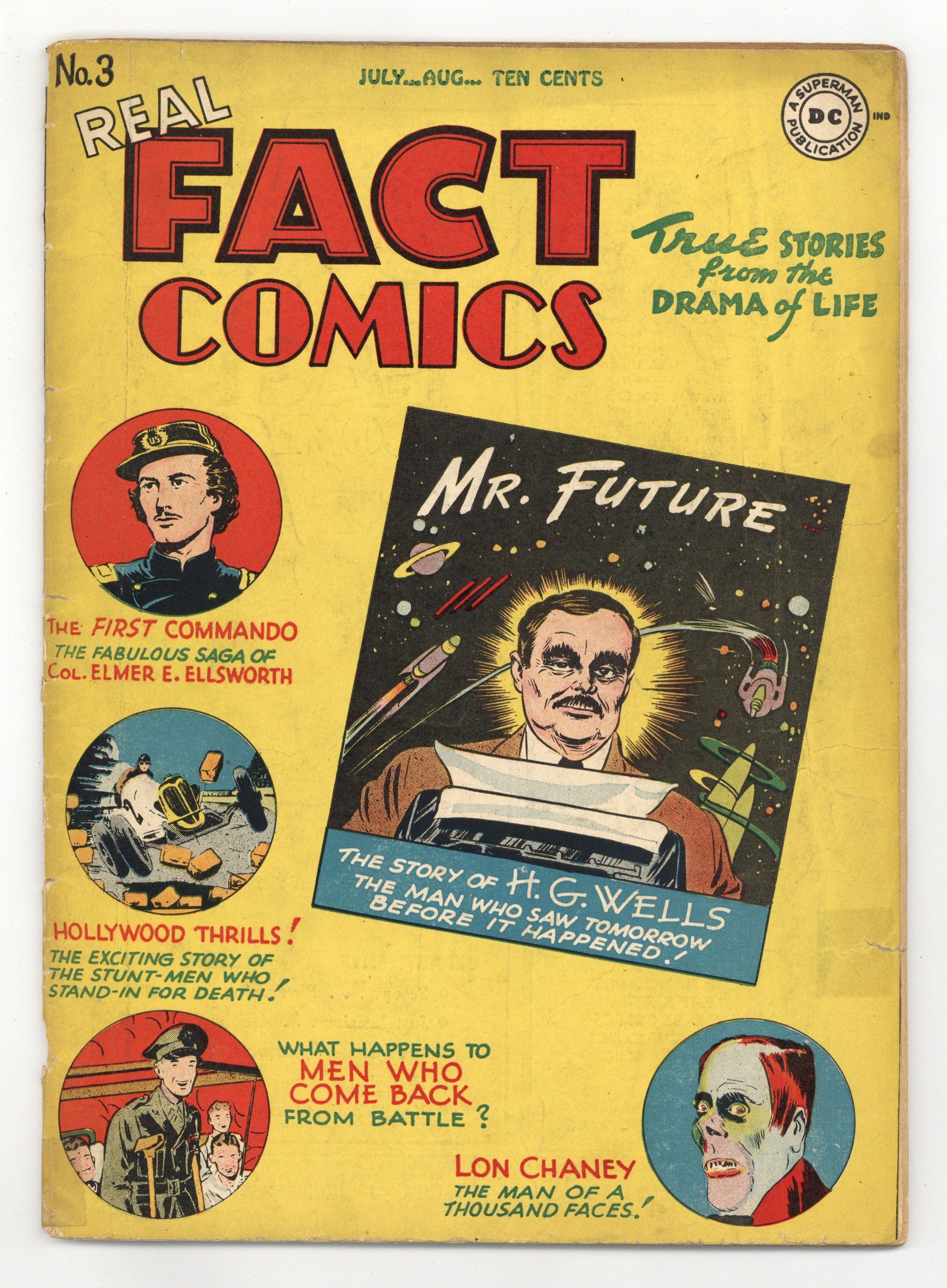 Cover art by Dick Sprang. Mr. Future featuring H.G. Wells, script by Jack Schiff, Mort Weisinger, and Bernie Breslauer, art by Dick Sprang. War In A Ward! featuring Tom Roberts, script by Jack Schiff, Mort Weisinger, and Bernie Breslauer. Joe Louis feature, art by Phil Berube. A Second Deluge, script by Jack Schiff, Mort Weisinger, and Bernie Breslauer, art by Clemens Gretter. King of Signs featuring Douglas Leigh, script by Jack Schiff, Mort Weisinger, and Bernie Breslauer, art by Stookie Allen. The Man of a Thousand Faces featuring Lon Chaney, script by Jack Schiff, Mort Weisinger, and Bernie Breslauer, art by Lee Harris. Warrior Bold starring Col. Elmer E. Ellsworth, script and art by Fred Ray. DC's first letter column, featuring a missive from Forest J Ackerman. 52 pgs. $0.10. Cover price $0.10.
