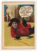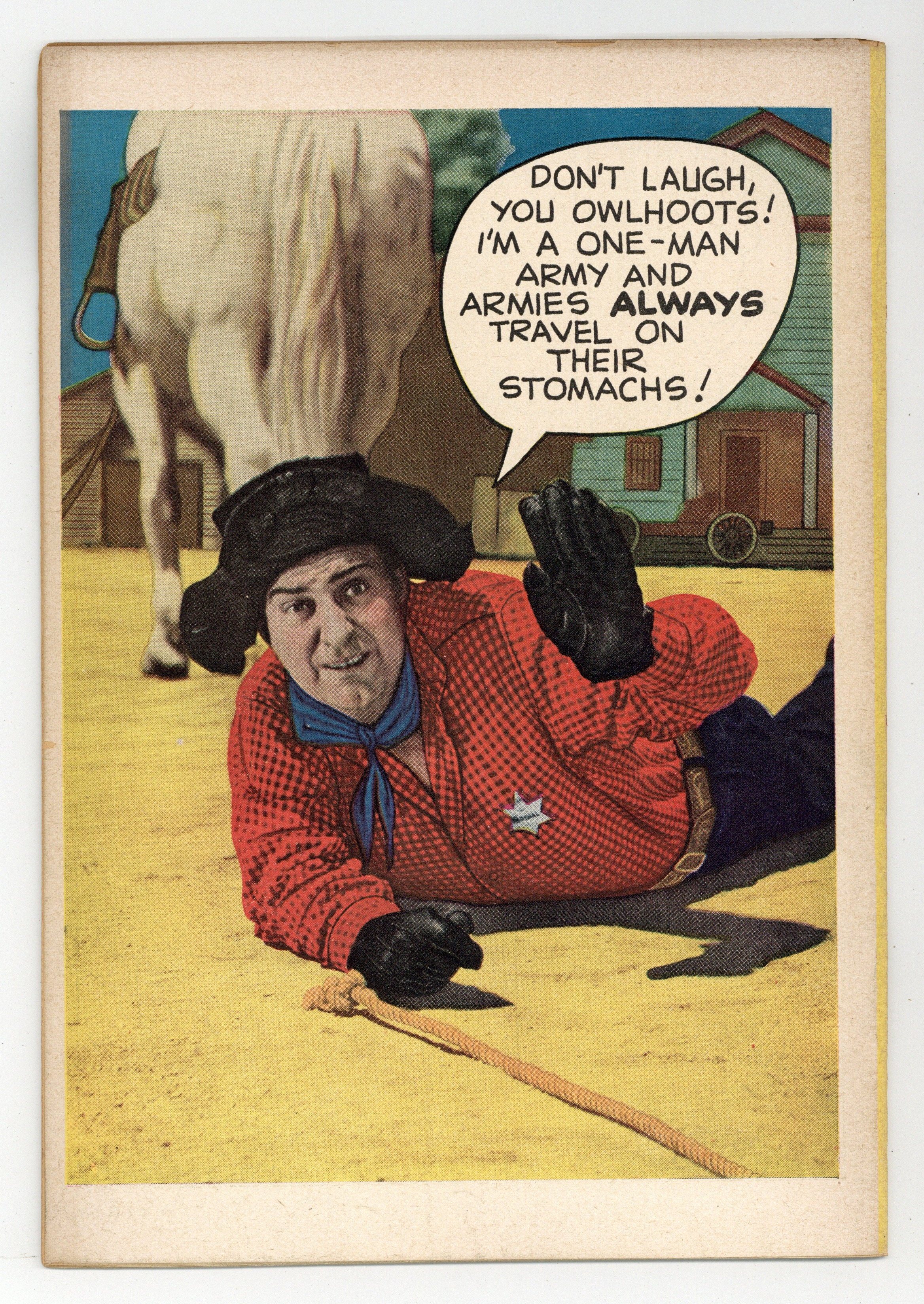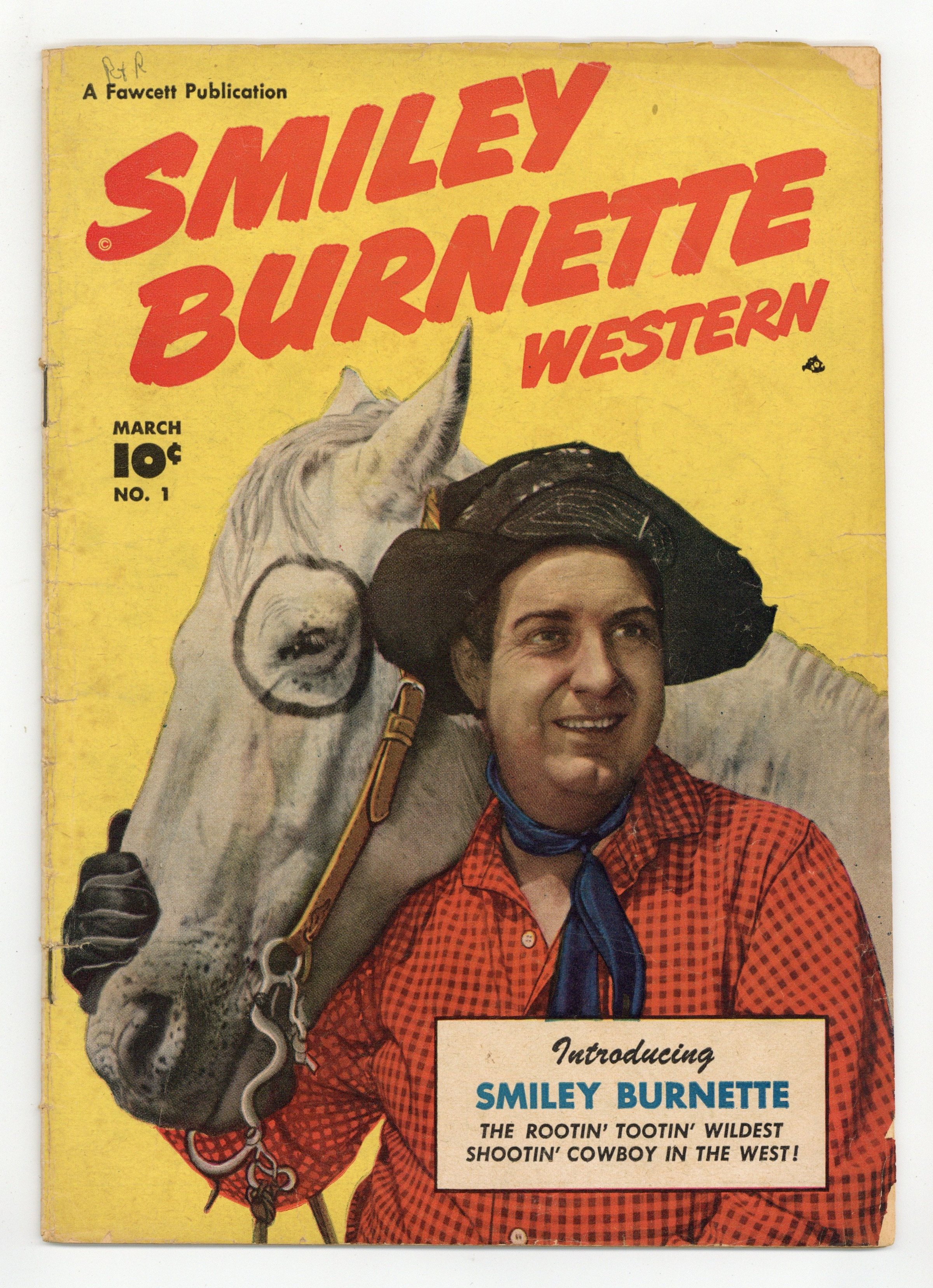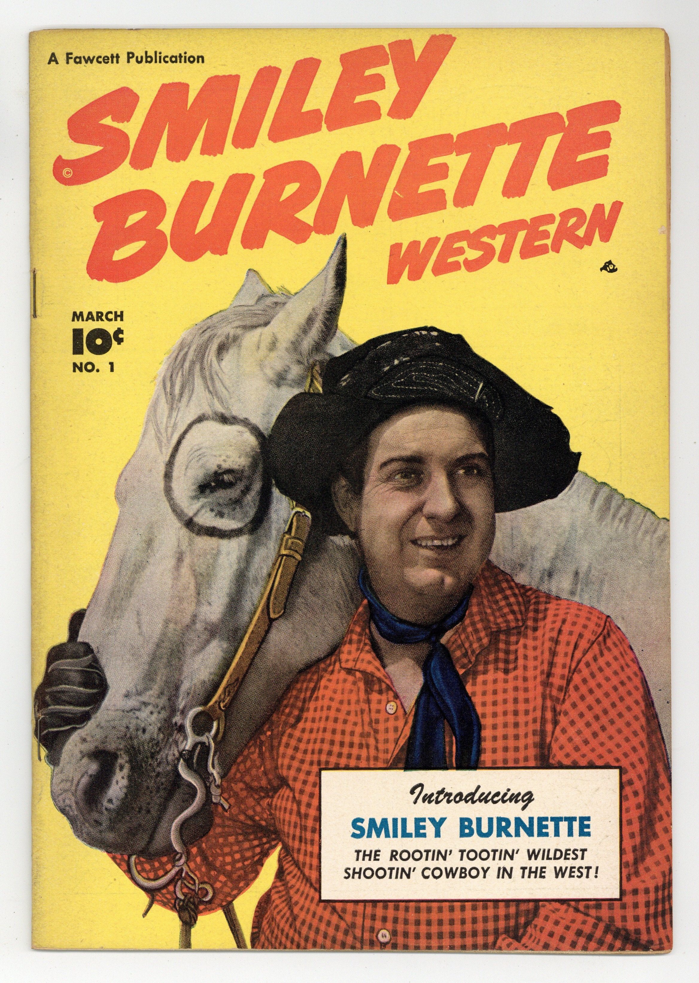The comic adventures of Smiley Burnette, best known as the sidekick to Gene Autry, Roy Rogers, and other movie cowboys. Smiley's comedic introduction to comics is a parade through town that he financed himself, to boost circulation of the "Burnette's Bugle" newspaper. Meanwhile, Spike-Nose Ned uses the parade as a distraction to rob the Wells Fargo safe. When Smiley's horse Ring Eye is horsenapped, Smiley risks his life to save him. The Trapping of Spike-Nose Ned; Red Eagle: The New Chief; Dirty Dabble, the Dastardly Double; Owlhoot Justice; Revenge for Ring-Eye. 32 pages, Full Color. Cover price $0.10.