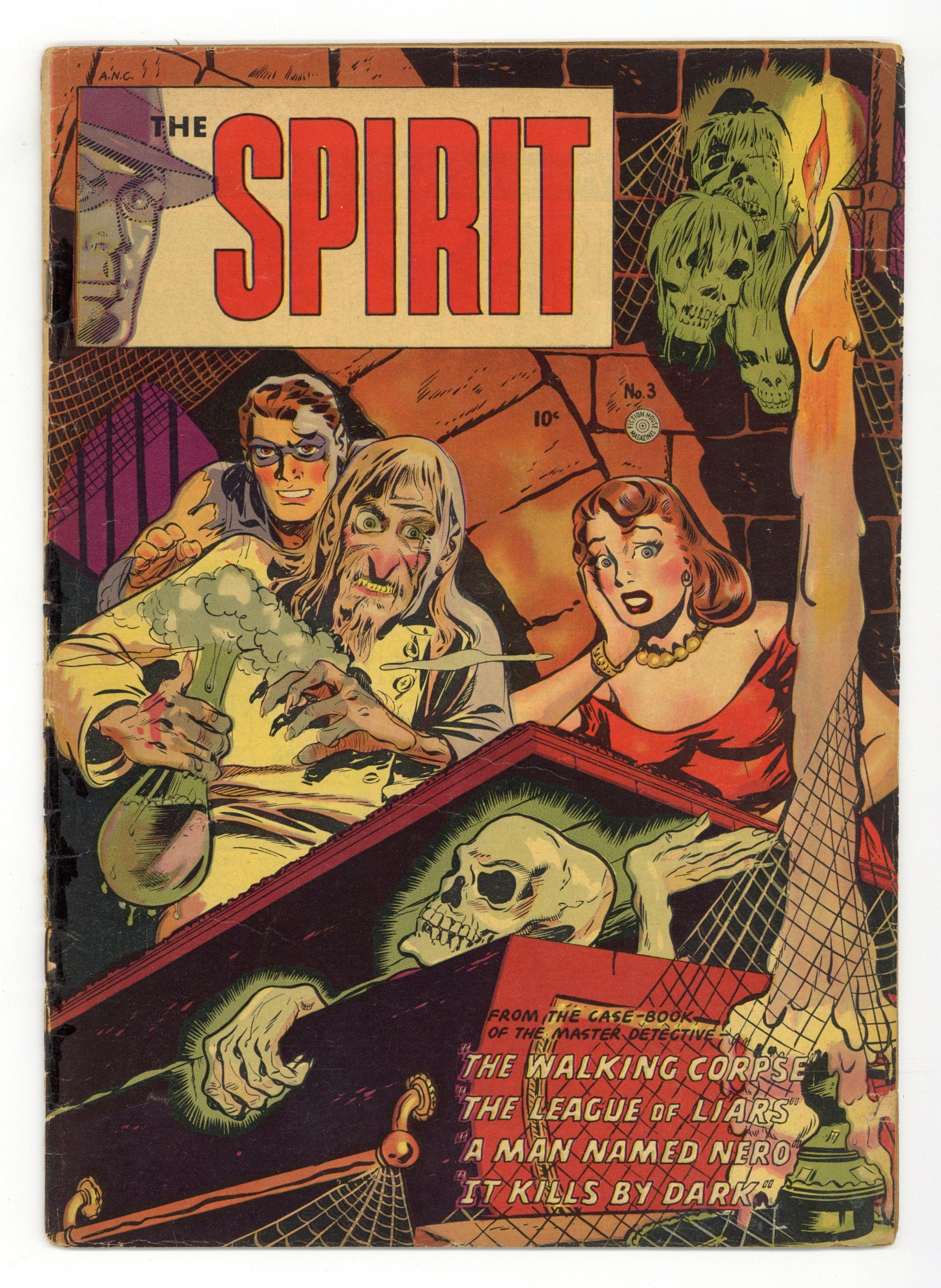 Stories by Jules Feiffer and Will Eisner. Art by Jim Dixon and Al Wenzel. Reprints of the later years of the Spirit strip, when Will Eisner's crimefighter was being run by other cartoonists in his studio. This issue includes Spirit strips #600, 610, 613, and 615. The Octopus wins an I Hate the Spirit essay contest; The Spirit goes into a collapsed mine to save trapped miners and discovers evidence of a murder; Mad Mr. Nero builds a replica of the Coliseum, and tries to feed the Spirit to the lions. The Walking Corpse; It Kills by Dark; The League of Liars; A Man Named Nero. 32 pages, Full Color. Cover price $0.10.