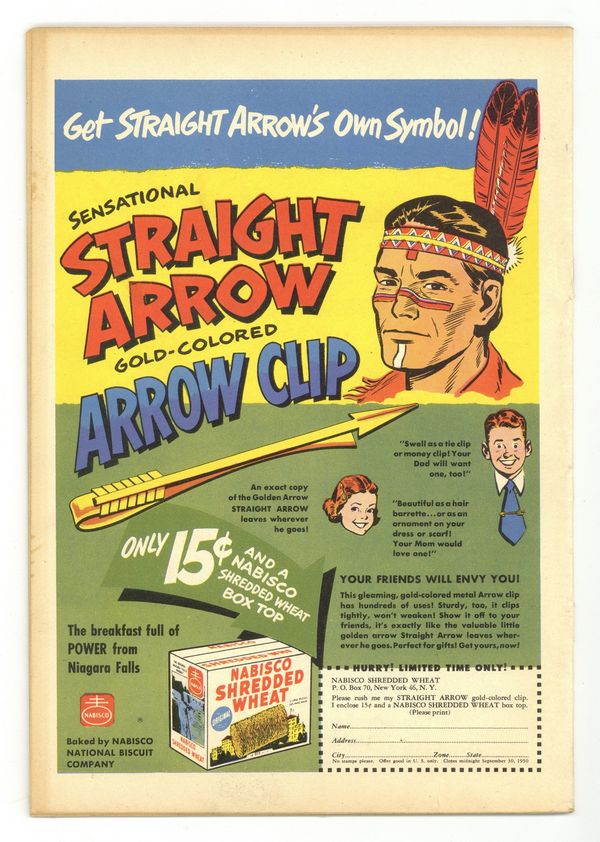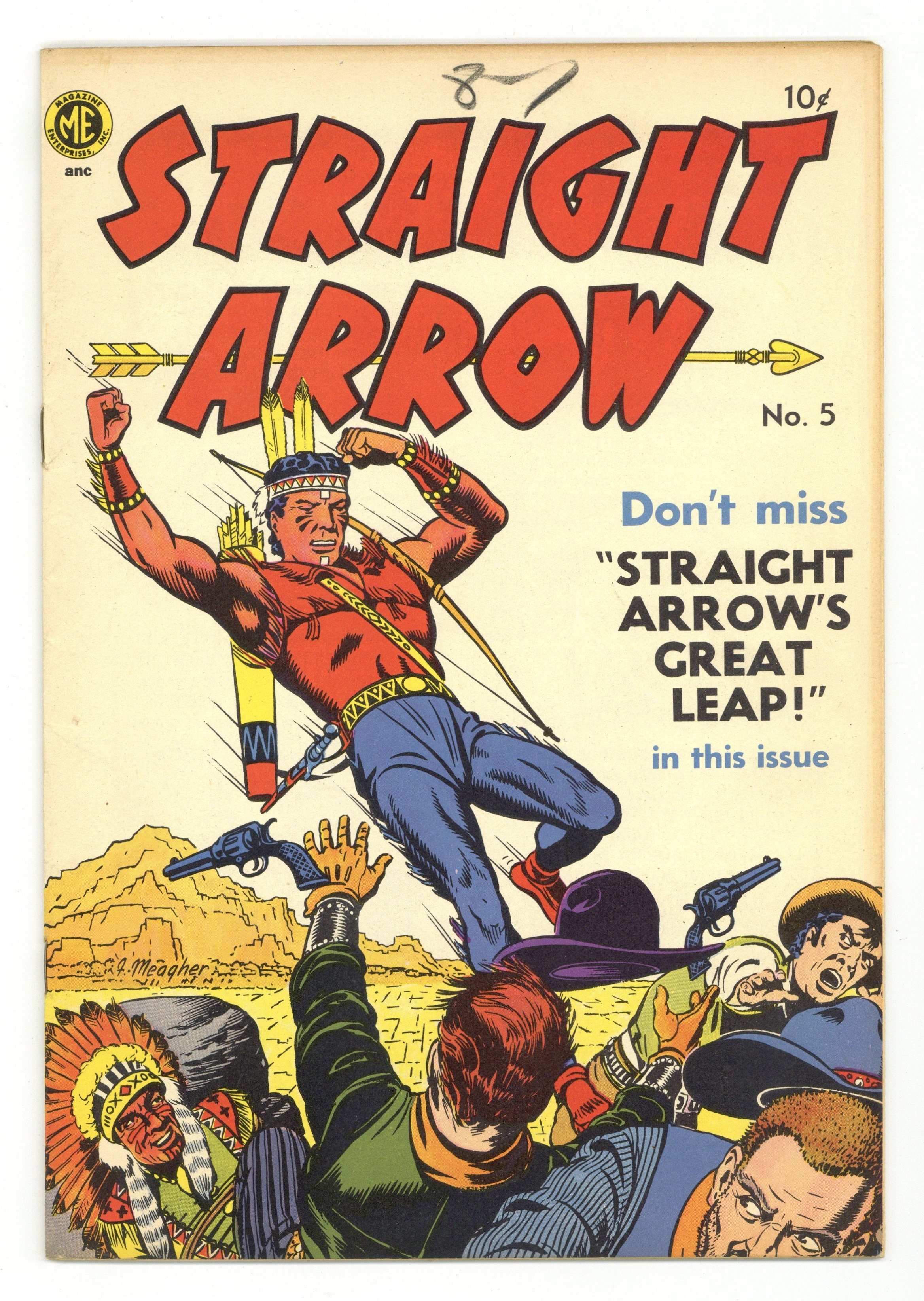 Stories by Gardner Fox and others. Art by Bob Powell and Fred Meagher. Cover by Fred Meagher. Rancher Steve Adams, a Comanche raised by white settlers, has a secret identity as the warrior Straight Arrow, a hero who first appeared on a popular radio show. Outlaws believe they have killed Straight Arrow, but his ghost rides after them; Red Hawk seeks the legendary Rain Drum to save his tribe from drought; After Red Sky finds silver high in the mountains, bandits want him to show the way. Plus non-fiction features on tribal tools and the Comanche. Animal Tricks; The Ghost of Straight Arrow!; Mission of Hate!; Red Hawk: Quest of the Rain Drum!; The Comanche; Straight Arrow's Great Leap...! 32 pages, Full Color. Cover price $0.10.