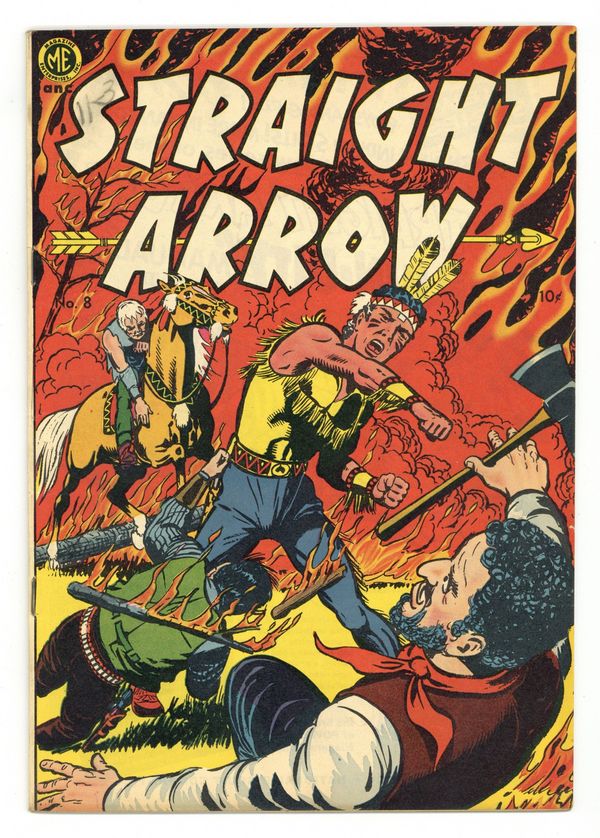 Stories by Gardner Fox and others. Art by Bob Powell and Fred Meagher. Cover by Fred Meagher. Rancher Steve Adams, a Comanche raised by white settlers, has a secret identity as the warrior Straight Arrow, a hero who first appeared on a popular radio show. Straight Arrow braves a forest fire to rescue a lumber camp; Deadbeat Dawson's gang robs mail trains with impunity until they run up against Straight Arrow; An outlaw trains his dog Fang to aid him in his crimes. The Flaming Trail!; Four Against the 7th; Robbery Rides the Rails!; Red Hawk: Cheyenne Challenge; The Rhyming Robber!; Fang - Hound of Terror. 32 pages, Full Color. Cover price $0.10.