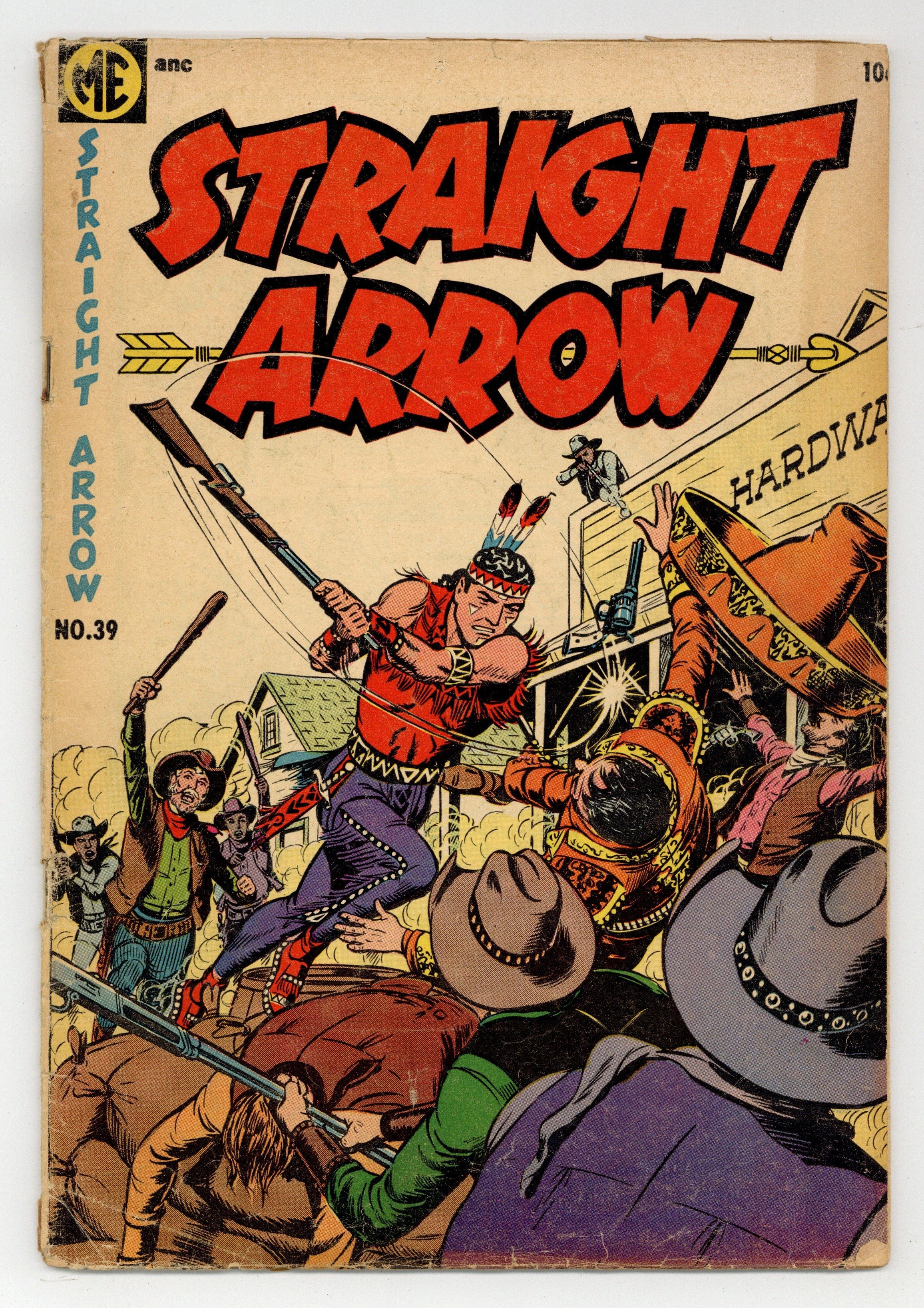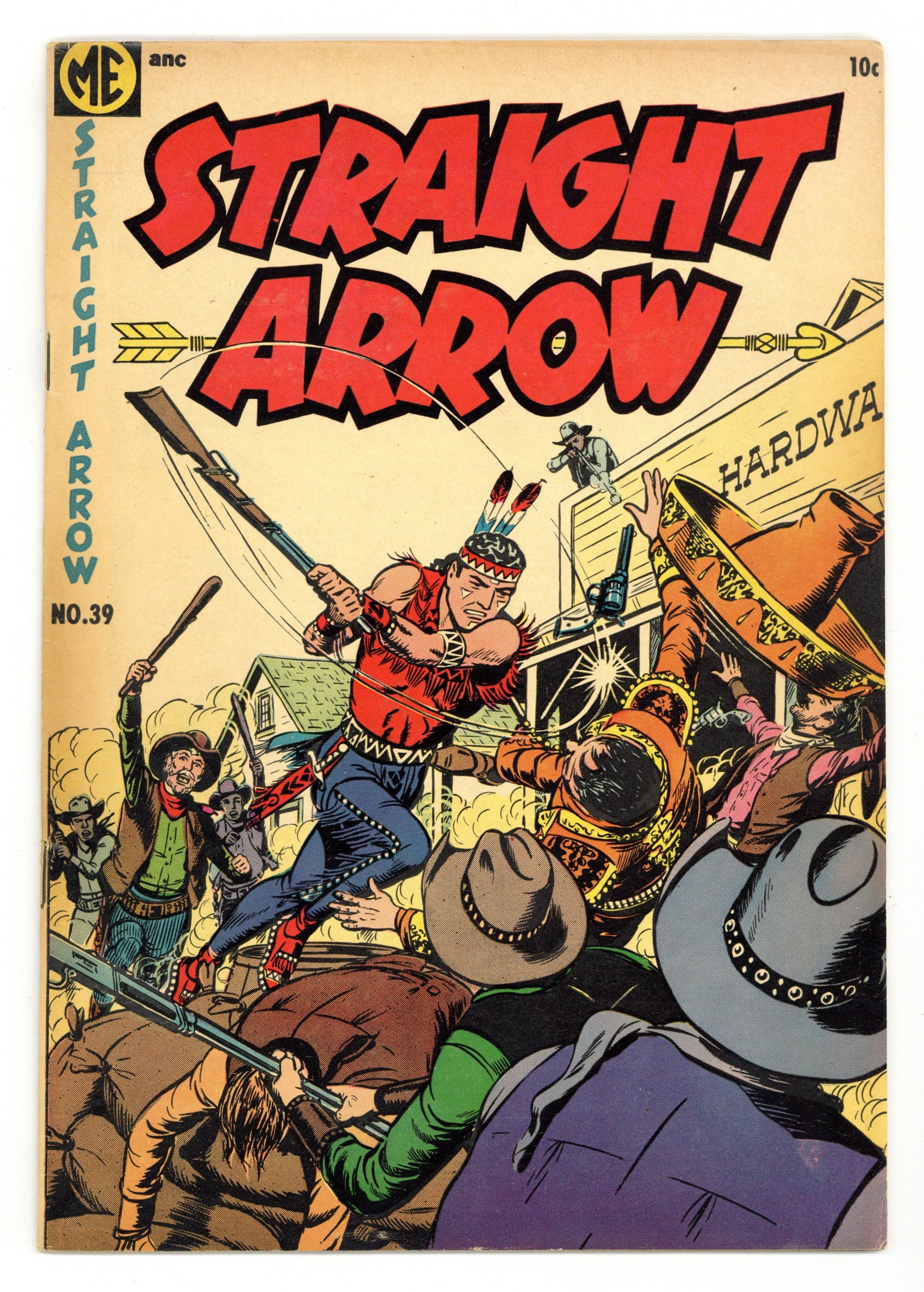 Art by Bob Powell and Fred Meagher. Cover by Fred Meagher. Rancher Steve Adams, a Comanche raised by white settlers, has a secret identity as the warrior Straight Arrow, a hero who first appeared on a popular radio show. Straight Arrow is attacked by outlaws while seeking missing stagecoaches. A long-dormant egg hatches into a T-Rex in the Old West, in a story with great dinosaur art by Bob Powell. A wounded Straight Arrow rides into a lawless town. The Vanishing Stagecoaches; Straight Arrow; Red Hawk: The Canyon Beast; Showdown in Skelton Canyon. 32 pages, Full Color. Cover price $0.10.