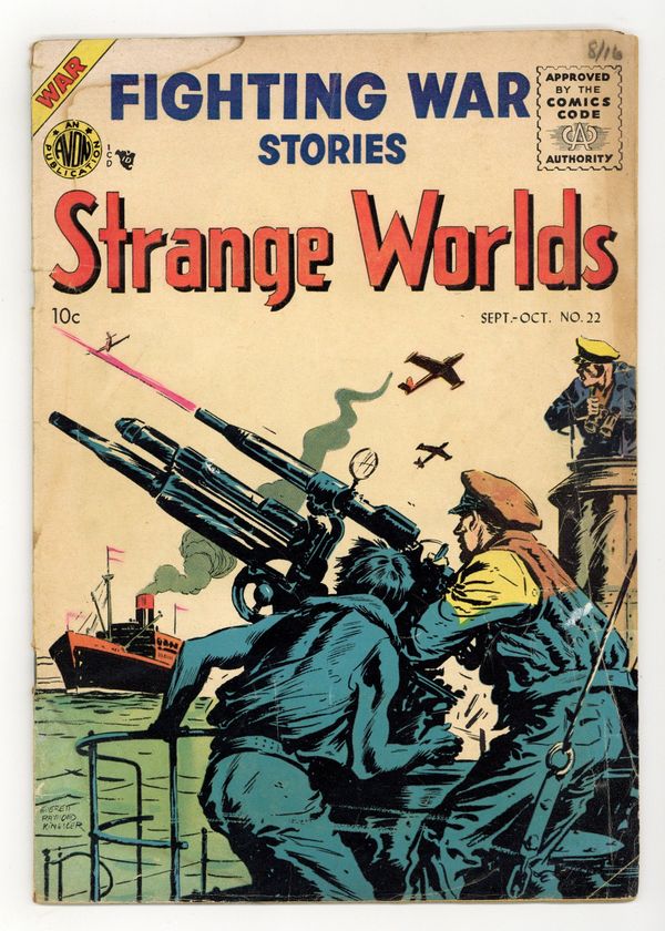 Art by Louis Ravielli, Vince Alascia, Mel Keefer, and Gene Fawcette. Cover by Everett Raymond Kinstler. Strange Worlds, formerly a science fiction title, continues in the Comics Code era as a war comic, reprinting stories from US Marines in Action (1952) #2. A Marine task force undertakes an impossible mission to the Korean shore; A mismatched duo finds unexpected danger on a mission behind enemy lines; A reckless pilot endangers his unit to win a contest with his brother, also a hotshot pilot. Also featuring another fine cover by Everett Raymond Kinstler. Operation Boomerang; Candidate For A Firing Squad; The Picture of Doom; Glory Sky-Ace; Death Trap; Submarine Fighters. Final issue of the series. 32 pages, Full Color. Cover price $0.10.