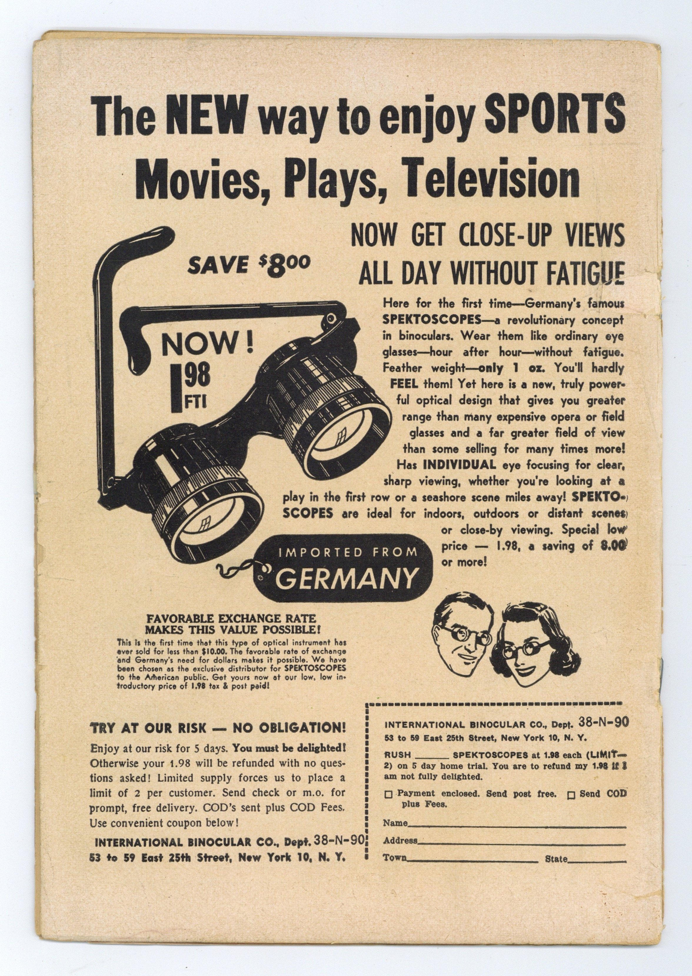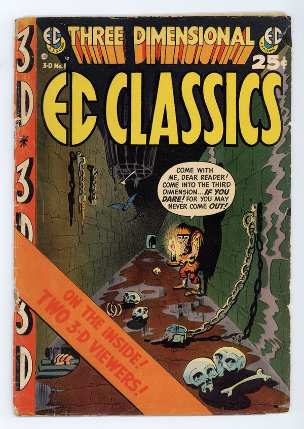 "V-Vampires" (art by Wally Wood, story from Mad 3), "The Monster From the Fourth Dimension" (art by Bernard Krigstein, story from Weird Science # &), "Frank Luke" (art by George Evans, story from Frontline Combat # 13), and "Mr. Biddy, Killer" (art by Graham Ingels, story from Crime SuspenStories 5). Stories redrawn to 3-D format. Original stories not necessarily by the artists here. Series continues as Three Dimensional Tales From the Crypt. Harvey Kurtzman cover. NOTE: This issue was originally distributed with 3-D glasses, but available copies may or may not still have them; see individual item notes for details. Cover price $0.25.