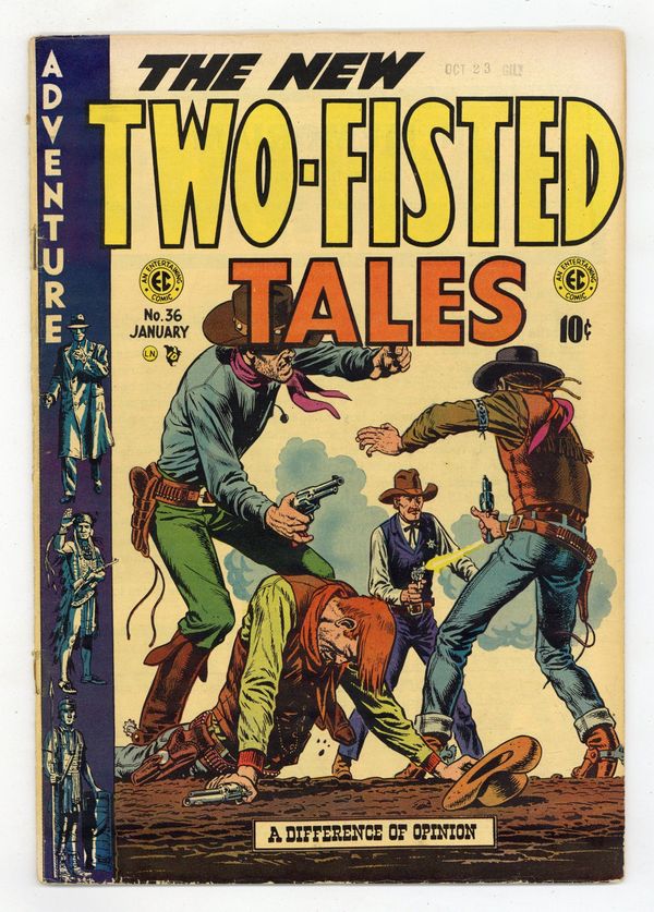 Cover by John Severin and Will Elder. Stories by Colin Dawkins and Robert Graves. Art by John Severin, Will Elder, Reed Crandall, and Jack Davis. Harvey Kurtzman's legendary series enlisted top EC artists for gritty tales of war and adventure. A sheriff's orphaned son returns to town years later to find his father's killer. Roman General Aulus faces insurmountable British forces, in a story inspired by Robert Graves and illustrated by Reed Crandall. Gunfire!; Battle!; Lone Wolf Constable; Justice!; Dangerous Man! 36 pages, Full Color. Cover price $0.10.