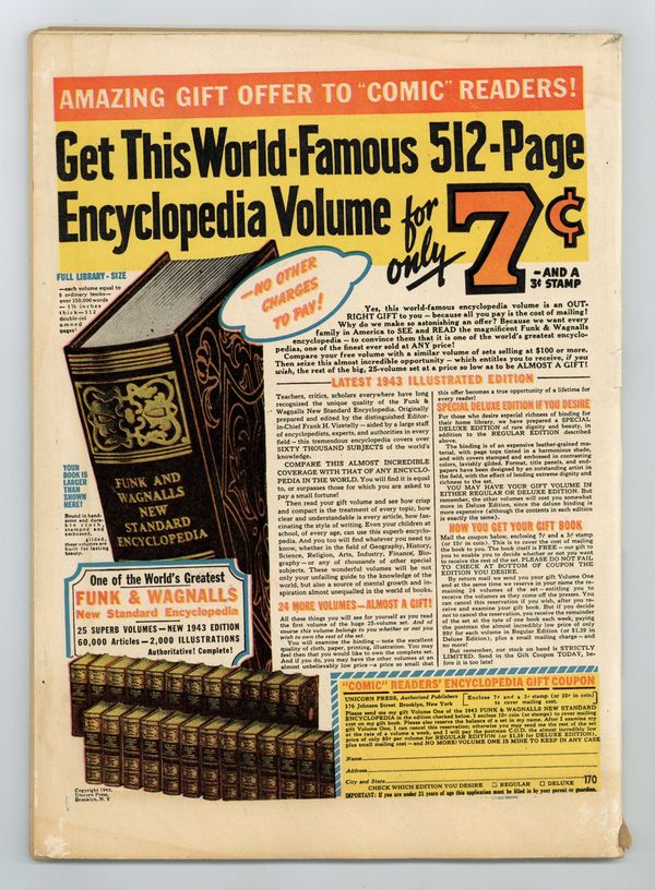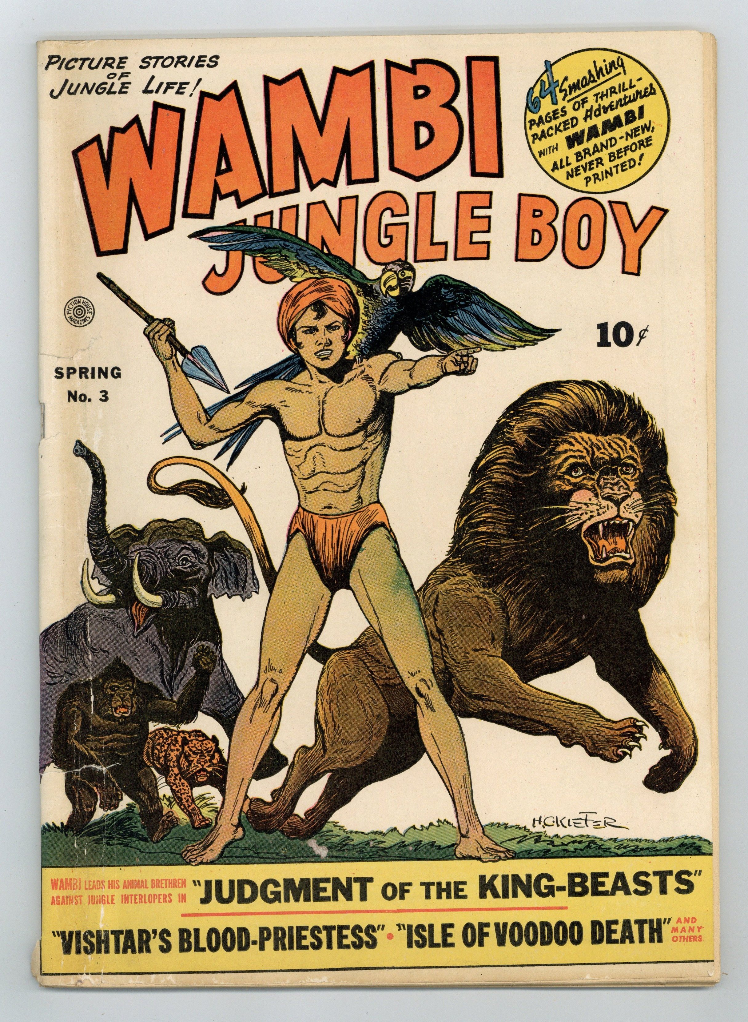 Published Mar 1943 by Fiction House.$110.00Art by Henry Kiefer and others. Cover by Henry Kiefer. Jungle hero Wambi is a boy who can talk to animals, including his friends Tawn the elephant and Ogg the ape. A greedy white trader tricks a native woman into retrieving a forbidden ruby from a jungle temple. A sinister woman captures Wambi and friends on her island of death, leading to a battle between Wambi's animal pals and her trained crocodiles. Wambi offers fun facts about African wildlife, such as the Nepenthes, or pitcher plant. The Ruby of Doom!; Isle of Voodoo Death; Corno the Rhinoceros; Wambi Battles the Devil Doctor!; Wambi Tells About Jungle Oddities; Vishtar's Blood-Priestess; Jungle Justice; Wambi Tells About Nepenthes the Murder Plant!; Judgment of the King-Beasts. 68 pages, Full Color. Cover price $0.10.