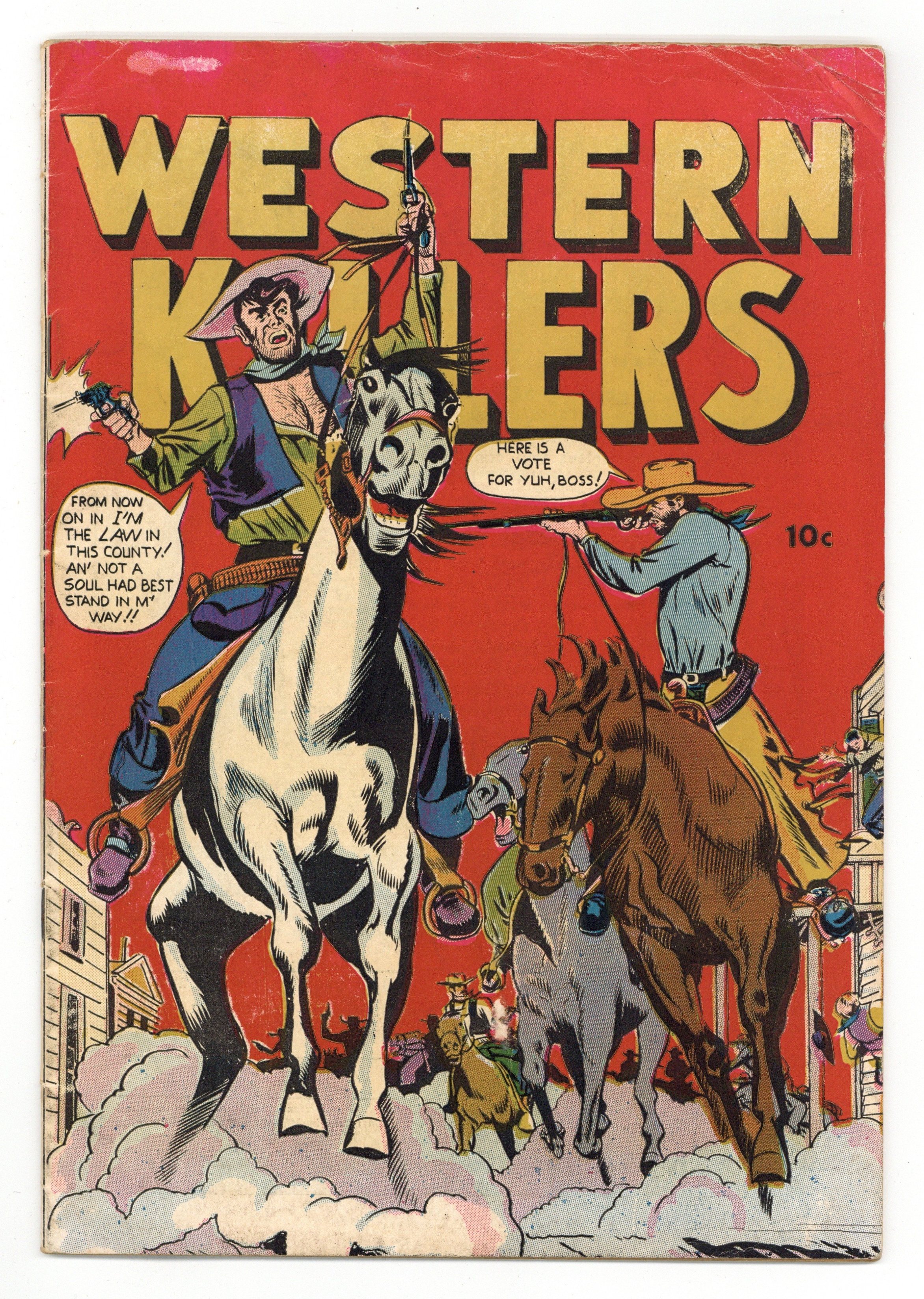 No number, not dated (c. early 50's). The cover is reprinted from Western Killers #63 (March 1949) with some alterations, such as the removal of the Fox logo. However, the interior pages are from Range Riders #1 (1950). For unknown reasons, it seems apparent that this cover was reprinted expressly for the purpose of binding it to unsold copies of Range Rider #1. The practice of binding new covers to unsold copies for resale is not unheard of from this time period. NOTE: First story page is missing. Normally, it would have been printed on the inside front cover of Range Rider's #1, but the new Western Killers cover replaces it with a chewing gum ad.