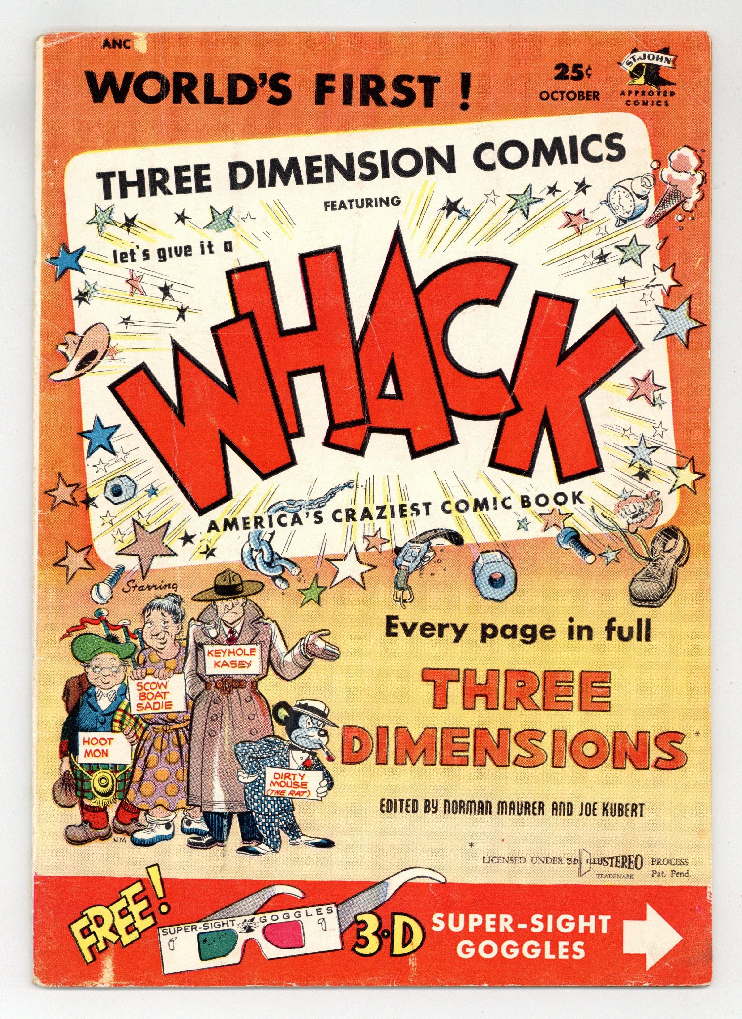 Does not include original 3-D glasses. Cover by Norman Maurer. Stories and art by Joe Kubert, Norman Maurer, and Dave Berg. Another Mad clone, this one produced by comics legend Joe Kubert and Norman Maurer of Tor fame; the first issue was in 3-D. Private nose Keyhole Kasey (who looks like Dick Tracy's half-brother) investigates after Protection Louie is found dead. In a spoof of funny-animal stories, with art by future MAD artist Dave Berg, Dirty Mouse is a gangster who's taking advantage of kindly Wilfred Wolf. Norman Maurer and comics legend Joe Kubert portray themselves in a self-deprecating look at the comics industry during the era of 3-D comics. Ghastly Dee-Fective Comics; Tales of the Wooly West Starring Hoot Man; The 3-D-Ts; The Mouse of Evil: A Case of the Jitters; A Grim Fairy Tale!; Lovely Love Comics. 32 pages, B/W with 3-D effects. Cover price $0.25.
