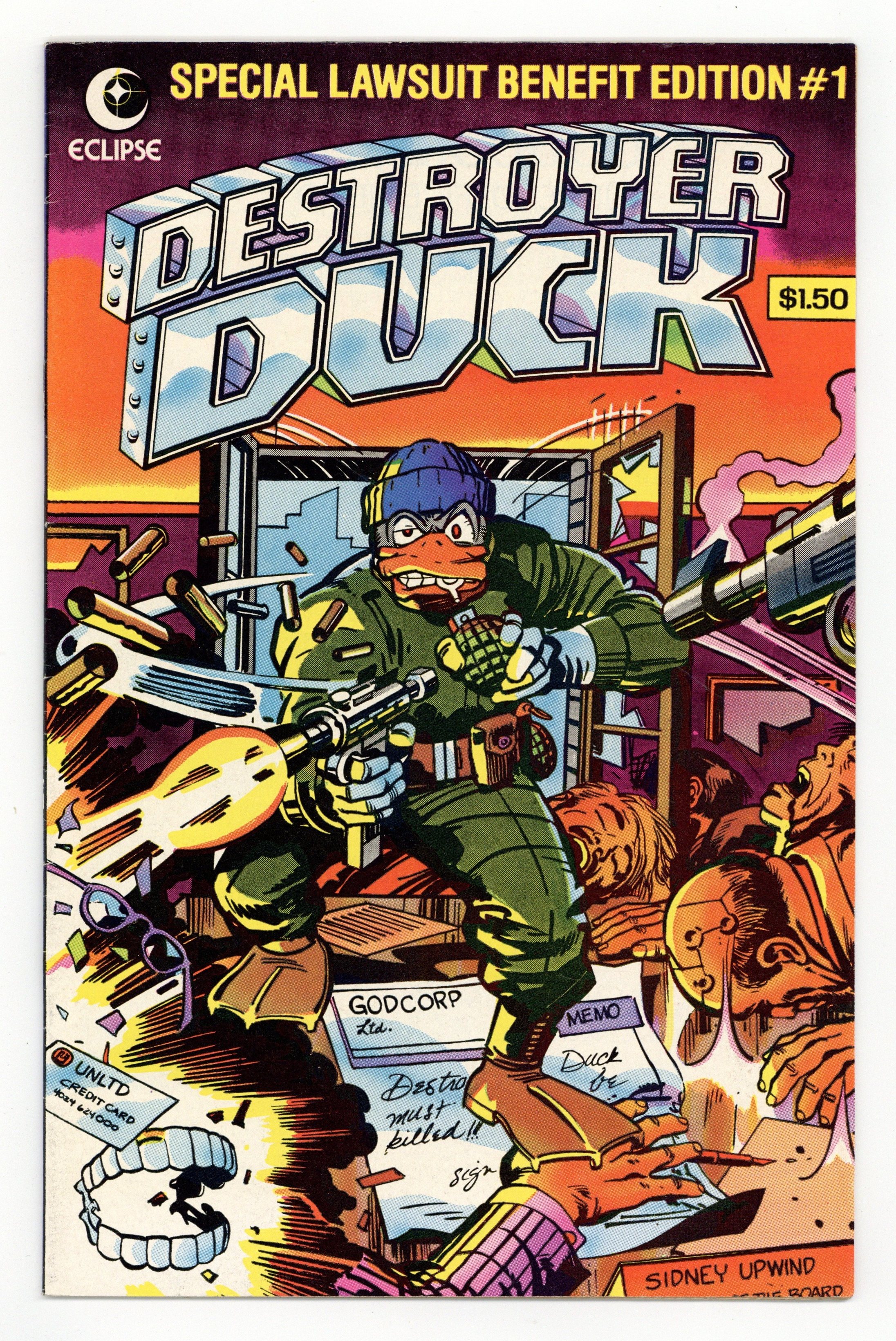 "Special Lawsuit Benefit Edition." At the height of their legal battles with Marvel, Steve Gerber and Jack Kirby teamed up for this benefit comic, in which a gun-slinging duck seeks revenge against an evil megacorporation. Art and stories donated by Mark Evanier, Dan Spiegle, Scott Shaw!, Alfredo Alcala, Steve Leialoha, Shary Flenniken, Martin Pasko, and Joe Staton. All this plus the first-ever appearance of Sergio Aragones' Groo the Wanderer. Full color; 36 pages. Cover by Kirby and Neal Adams! Cover price $1.50.