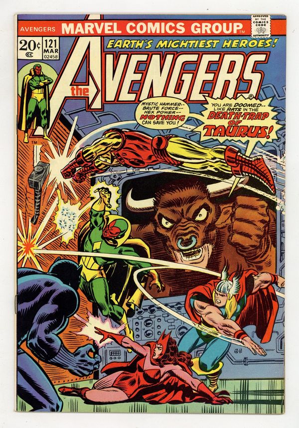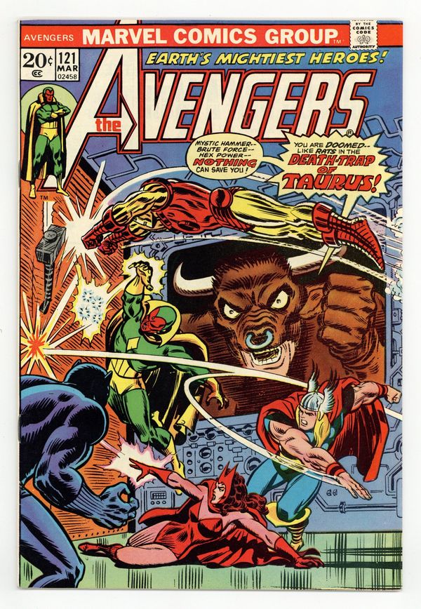 Tags: Marvel Legacy Numbering: Avengers (part 121), Avengers$8.50"Houses Divided Cannot Stand!" Part 2 of 3. Script by Steve Englehart. Art by John Buscema (layouts) and Don Heck (finishes). Cover by Ron Wilson and John Romita. At the World Trade Center, the ferocious battle between the Avengers and the Zodiac rages! After the Sentinel of Liberty joins the fight the tide turns in favor of the heroes! But when Aries throws Mantis off one of the 110-story towers, the tide takes a lethal turn! However in spectacular style, the Vision dramatically saves Mantis from certain death! Several hours later Earth's Mightiest Heroes track the Zodiac to Cornelius Van Lunt's New Jersey headquarters. And for the third time in as many days, the Mighty Avengers throw down with the super-villains from the stars! Meanwhile, as she recovers from her injuries, Mantis remains thoroughly impressed with the synthezoid avenger. Is that going to cause problems between her and the Swordsman? Stay tuned! Avengers Lineup: Black Panther, Captain America, Iron Man, Mantis, Scarlet Witch, Swordsman, Thor, and the Vision. (Notes: The letters page contains Marvel Value Stamp series A #84 Dr. Doom. The bullpen bonus page contains promotional stamp #5 the Hulk. The promotional stamp is not to be confused with the actual series A stamp #5.) 36 pages Cover price $0.20.