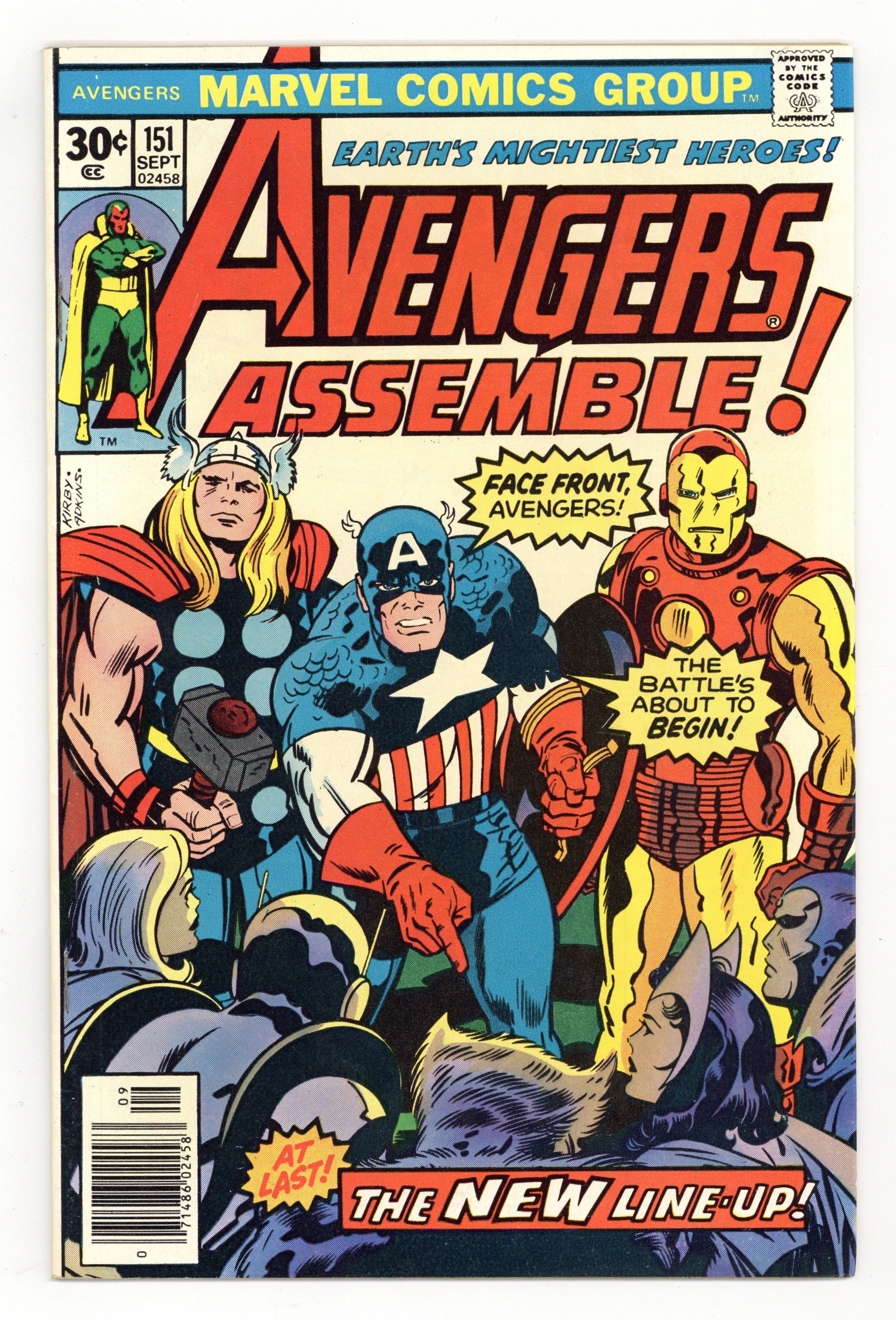 "At Last: The Decision!" Part 2 of 2. Script by Steve Englehart, Gerry Conway, and Jim Shooter. Pencils by George Perez. Inks by John Tartaglione. Cover by Jack Kirby and Dan Adkins. Finally, the Avengers are ready to set their new roster! Iron Man agrees to be chairman! Cap stays! Wanda and the Vision remain with the group! The Wasp eagerly signs up! Yellowjacket first declines but then changes his mind! Moondragon decides to leave, and Hellcat goes with her. The bombastic Beast jubilantly joins! And Wonder Man...hold on, what? How? Wow! Cameo appearances by Robert Frank (aka the golden age Whizzer), the Black Widow, Angel, Ghost Rider, Hercules, Iceman, Ben Grimm, Wonder Man, and the Living Laser. First 30¢ issue. (Notes: This issue concludes Steve Englehart's legendary 4-year run as the writer for Earth's Mightiest Heroes. A time period that produced many of the Avengers' all-time fan favorite stories including the three frequently reprinted sagas: the Avengers-Defenders War, the Celestial Madonna saga, and the Serpent Crown crisis. The letters page contains an essay explaining why the 150th anniversary story ended up as two issues.) 36 pgs. Cover price $0.30.