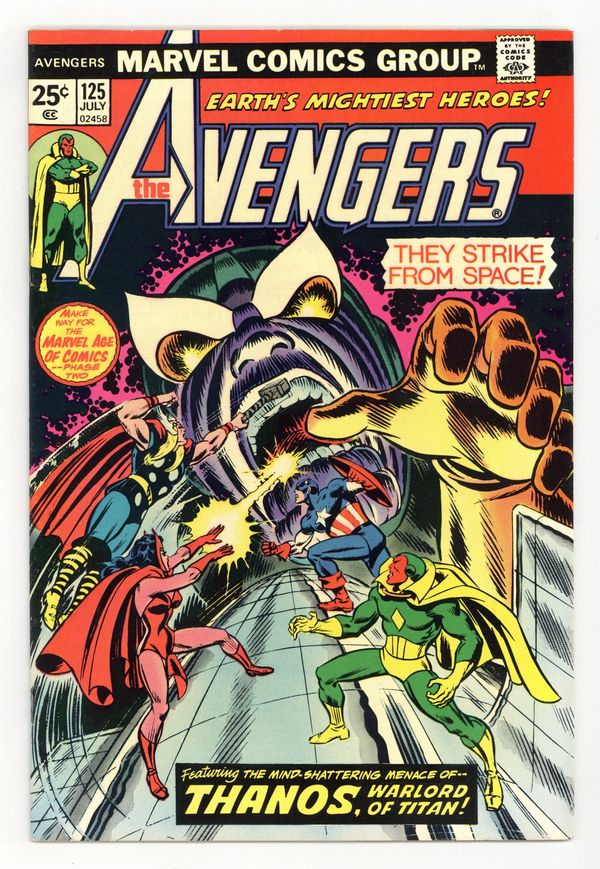 Tags: Marvel Legacy Numbering: Avengers (part 125), Thanos: The Final Threat (part 14), Avengers, Thanos$24.00"The Power of Babel!" Guest-starring Captain Marvel. Script by Steve Englehart. Art by John Buscema (breakdowns) and Dave Cockrum (finishes). Cover by Ron Wilson and John Romita. Story continues from Captain Marvel 32. Captain America returns to the Avengers just in time for an out-of-this-world adventure! Earth's Mightiest Heroes blast off into outer space to intercept Thanos' awesome armada headed towards Earth! The Avengers attack the alien starships and inflict heavy damage until they bump into a solid black force field! What's hiding behind the imposing barrier? The Vision, Scarlet Witch, Swordsman, and Mantis penetrate the force field and discover the mad Titan's massive command ship! And hordes of aliens inside! But these are four mighty avengers! With skill and teamwork, they disable the ship's universal translator and throw the entire attack fleet into chaos! Have the Avengers finally derailed Thanos' plan for conquest of the cosmos? Story concludes in Captain Marvel 33. Cameo appearances by Libra, Lou-Ann, Thanos, and the Skrulls. Avengers Lineup: Black Panther, Captain America, Iron Man, Mantis, Scarlet Witch, Swordsman, Thor, and the Vision. (Note: The letters page contains Marvel Value Stamp Series A #69 Marvel Girl.) 36 pages Cover price $0.25.