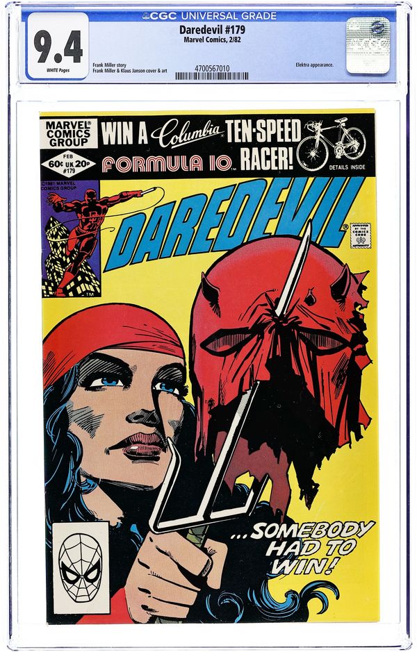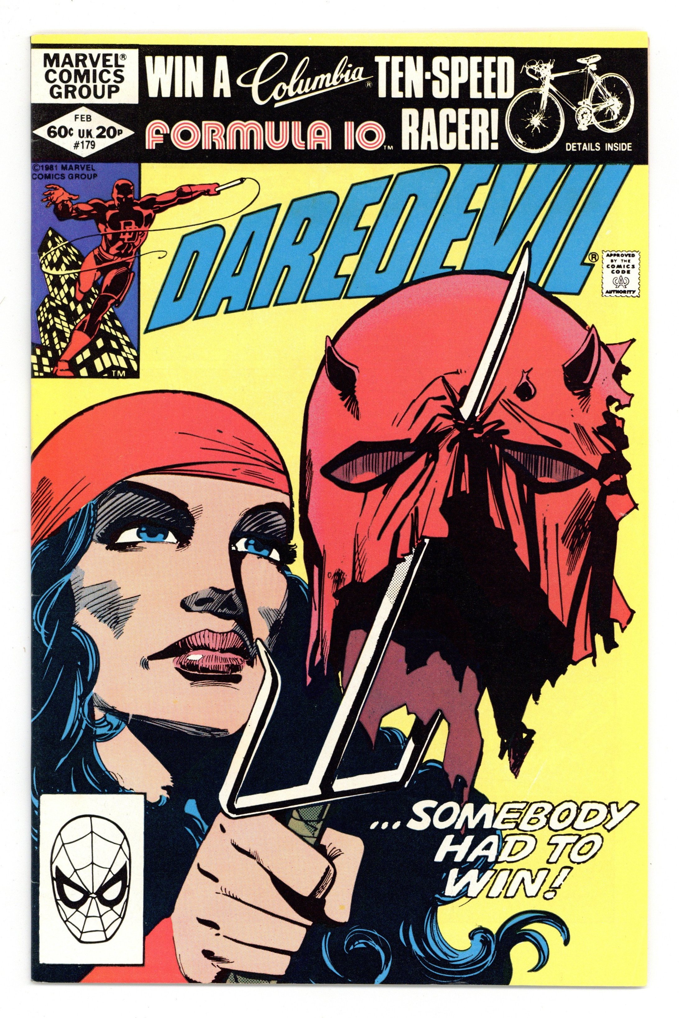 Direct Edition. Cover pencils by Frank Miller, inks by Klaus Janson. Spiked!, script by Frank Miller, pencils by Frank Miller (breakdowns) and Klaus Janson (finished art), inks by Klaus Janson; Ben is warned off of the Kingpin/Cherryh story by Elektra and Cherryh himself; When Ben and DD continue to dig, Elektra shows up and beats DD right before she throws a sai through Ben Urich; Story is narrated by Urich. Letter to the editor from comics editor Diana Schutz. 36 pgs. Cover price $0.60. Cover price $0.60.
