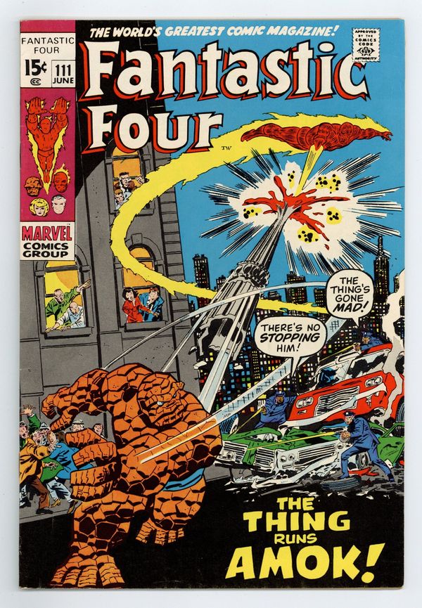 "The Thing Amok!" Script by Stan Lee. Pencils by John Buscema. Inks by Joe Sinnott. Cover by John Buscema and John Verpoorten. The Thing has gone crazy! And now he's running amok in Manhattan! Can the remaining members of the FF halt their rampaging teammate? The Human Torch tackles the Thing first, but to no avail! Ben Grimm looks unstoppable! Is anyone else available? Perhaps someone gargantuan, gamma-radiated, and green...and likes to smash! Oh my, the stage is set for an epic clash of the titans next issue! Cameo appearances by Agatha Harkness, Peter Parker, J. Jonah Jameson, Joe Robertson, and the Hulk. 36 pages Cover price $0.15.