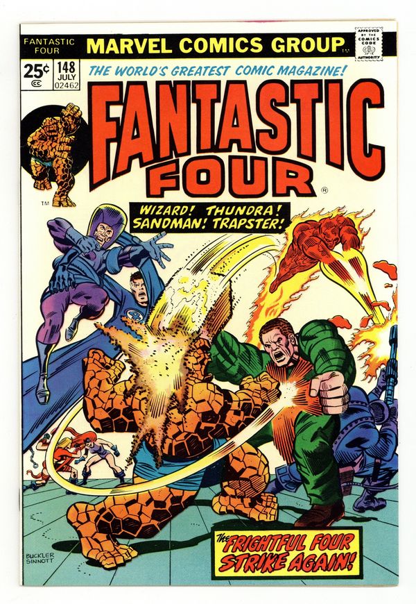 "War on the Thirty-Sixth Floor!" Guest-starring Thundra. Script by Gerry Conway. Pencils by Rich Buckler. Inks by Joe Sinnott. Cover by Rich Buckler and Joe Sinnott. Reed, Ben, Johnny, and Medusa are in a state of disbelief after the Invisible Girl decided to stay with Prince Namor last issue. Now the downtrodden foursome returns to the Baxter Building in search of peace and quiet. However, there are three very unwelcome visitors (of the super-villain variety) waiting inside! The Fantastic Four better snap out of the doldrums quick, because the Wizard, Sandman, and Trapster are ready to rumble! Cameo appearances by the Sub-Mariner and Triton (in disguise). 36 pages Cover price $0.25.