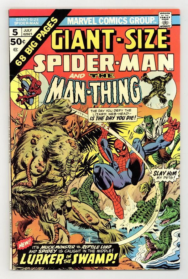 Tags: Spider-Man Clone Saga (part 00G), Spider-Man$16.50"Beware the Path of the Monster!" Guest-starring the Man-Thing. Script by Gerry Conway. Pencils by Ross Andru. Inks by Mike Esposito and Dave Hunt (backgrounds). Cover by Gil Kane. Peter Parker travels to Florida for a photo story on the mysterious Man-Thing. Before departing on his trip though, Peter calls his long-time friend and current sunshine state resident, Dr. Curt Connors, and asks for his assistance in locating the powerful swamp creature. Later on when the web-slinger arrives in Florida, he finds a creature of the swamp all right; but it's not the Man-Thing ? it's the Lizard! The three-way battle among the Lizard, Man-Thing, and the Amazing Spider-Man is awesome! Also in this issue, Peter consoles the confused clone of Gwen Stacy. (Note: This story takes place between Amazing Spider-Man issues 146 and 147.) Back up story: "Where Flies the Beetle!" Guest-starring the Human Torch. Script by Stan Lee. Art by Steve Ditko. The wall-crawler and the torch join forces to battle the Beetle! Reprinted from Amazing Spiderman 21. (Note: This issue includes a full-page ad for Hostess Twinkies featuring Captain Marvel vs. Nitro.) 64 pages Cover price $0.50.
