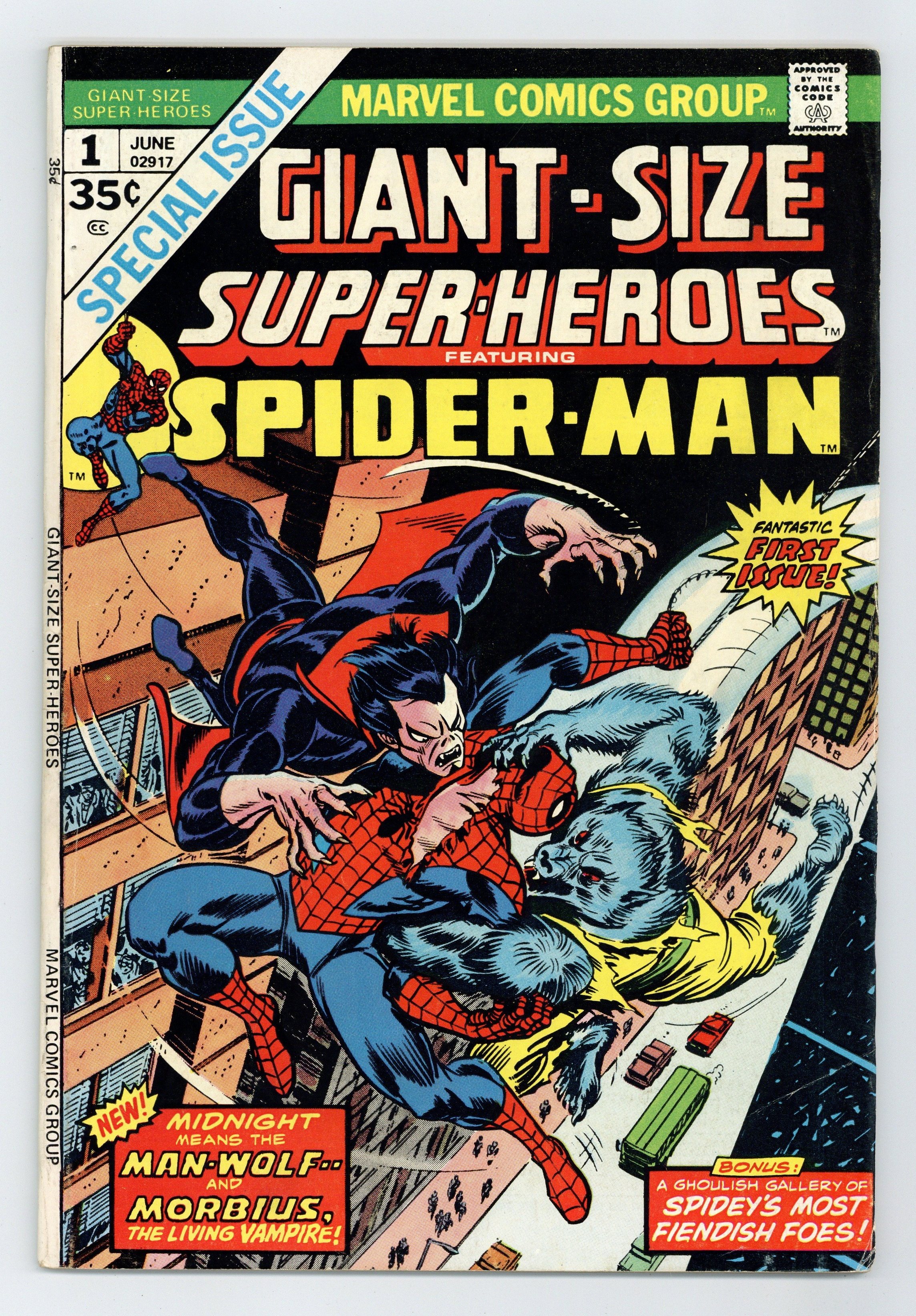 Starts May 4 48-page giant. "Man-Wolf At Midnight!" Guest-starring Spider-Man. Script by Gerry Conway. Pencils by Gil Kane. Inks by Mike Esposito. Cover by Gil Kane and John Romita. Morbius the Living Vampire in stalking Manhattan again! His first target is John Jameson, the Man-Wolf; and his second one ? the Amazing Spider-Man! Once Morbius reattaches the moonstone to John Jameson's neck, the Man-Wolf becomes his to command! Now under the cover of darkness, the deadly duo heads to Empire State University to break into the research laboratory, but the ever-present web-slinger intercepts them along the way! Can Spider-Man defeat these two creatures of the night? This issue includes a 1-page write-up from Roy Thomas describing the updated plans for Marvel's various Giant-Size series. This issue also contains a full-page Spider-Man pin-up by John Romita and a 6-page rogues' gallery of famous web-slinger foes drawn by Steve Ditko (reprinted from Amazing Spider-Man Annual 1). Back up feature: "How Stan and Steve Create(d) Spider-Man!" 3-page story also reprinted from Amazing Spider-Man Annual 1. (Note: The last panel of the main story indicates that there would be another issue of Giant-Size Super-Heroes; however, a second issue was never published.) Cover price $0.35.