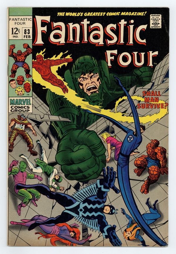 "Shall Man Survive?" Part 2 of 2. Guest-starring the Inhumans. Script by Stan Lee. Pencils by Jack Kirby. Inks by Joe Sinnott. Cover by Jack Kirby and Joe Sinnott. Maximus the Mad has conquered Attilan! And his next target is the entire planet! With the Fantastic Four and the Inhumans as his captives, Black Bolt's crazy brother is on the brink of world domination thanks to his powerful hypno-gun! But the Inhumans still have one card to play! Black Bolt's awesome voice! His booming voice could free the royal family from its prison! Or destroy the whole city! Likewise in a nearby chamber, the FF work feverishly to escape from their confinement! If both super-teams can break out, they'll have a chance to break up Maximus' mad plan of conquest! Cameo appearances by the Invisible Girl and (baby) Franklin. Inhumans Lineup: Black Bolt, Gorgon, Karnak, Medusa, and Triton. (Notes: This issue is the second appearance of Franklin Richards. Although the Invisible Girl appears on the cover, she is not in Attilan for the battle. Maximus returns in Incredible Hulk 119. The Inhumans appear next in Silver Surfer (1st series) 18. This issue includes a full-page ad for Avengers 60 and Amazing Spider-Man 69. This two-part story was reprinted in Marvel's Greatest Comics 64 & 65) 36 pages Cover price $0.12.