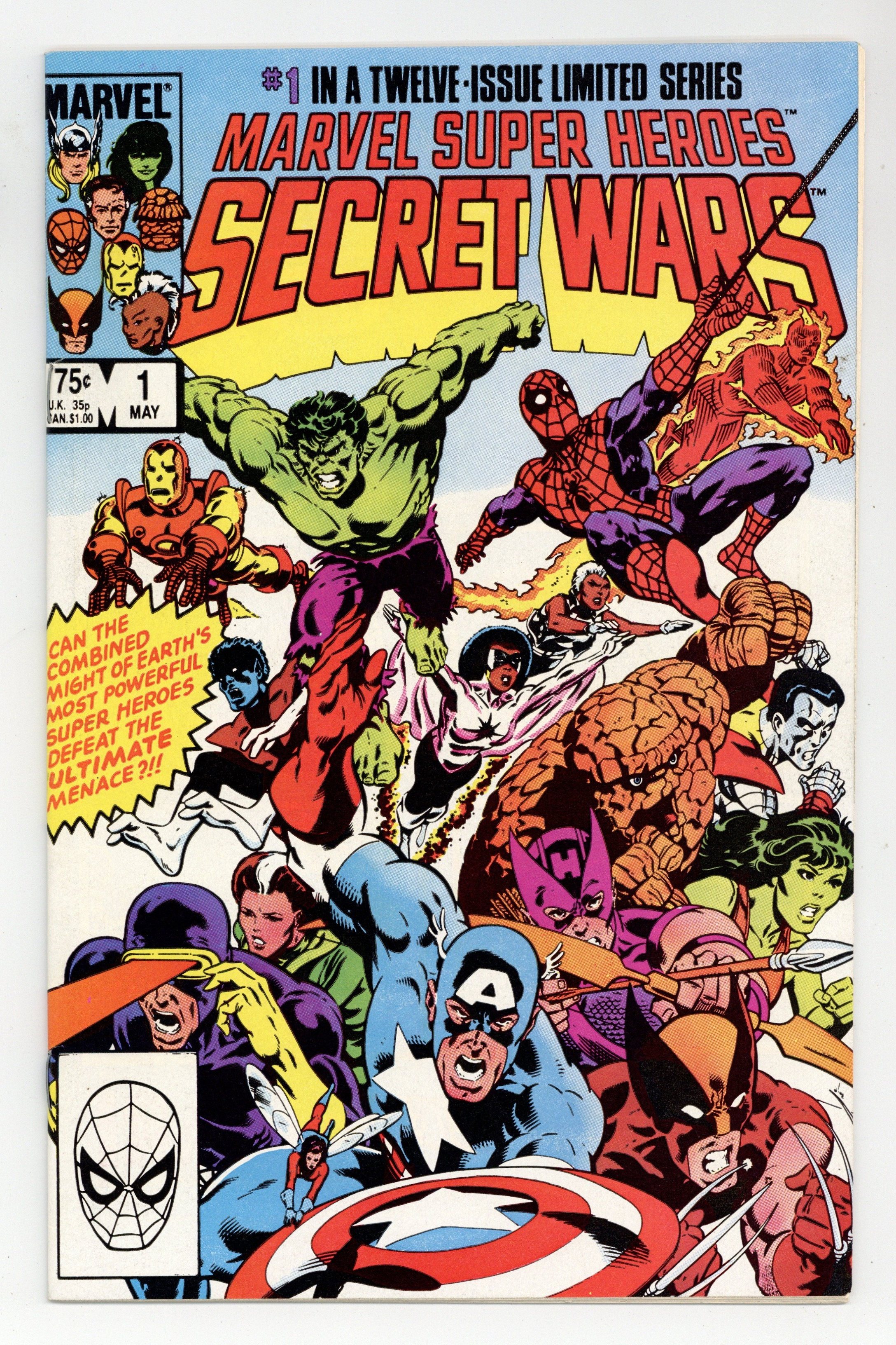 Direct Edition. "The War Begins!" Part 1 of 12. Story by Jim Shooter. Art by Mike Zeck and John Beatty. This is it, the granddaddy of all epic events. Before Identity Crisis, Infinite Crisis, House of M, Civil War, and Infinity Gauntlet there was Secret Wars. A nigh omnipotent being from beyond has, for lack of a better word, kidnapped the greatest heroes and deadliest villains in the Marvel Universe and whisked them to the far side of the universe to battle for the ultimate prize. One thing is for certain, the lives of these heroes and villains will never be the same again. - This is the first printing. Any 2nd printing will have the words "Second Printing" at the bottom of the first page. NOTE: Nearly all first printings contain a "Blue Galactus" from a printing error (a lack of magenta printing plates) that was corrected in later printings. While small number of First printings may have the correct colors, the majority of copies will have "Blue Galactus". Due to the frequency, "Blue Galactus" variants should be treated the same as other First Printings. 36 pages, full color. Cover price $0.75.