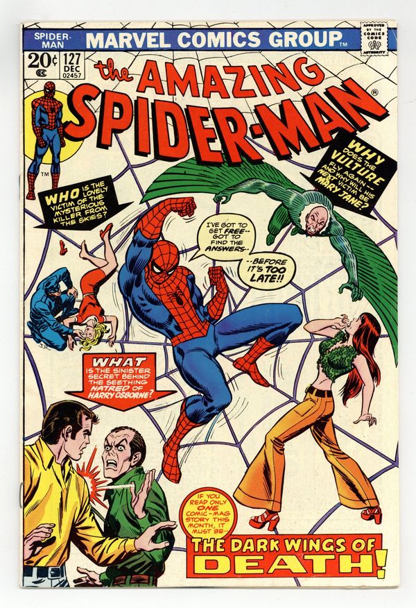 Starts Dec 15 "The Dark Wings of Death!" Part 1 of 2. First appearance of the third Vulture. Script by Gerry Conway. Pencils by Ross Andru. Inks by Frank Giacoia and Dave Hunt. Cover by John Romita. Outside her apartment window, Mary Jane Watson witnesses a murder! And she thinks the killer is the Vulture! However MJ is reluctant to go to the police in fear of retaliation -- despite Peter's recommendation to do so. The next day at Empire State University, Mary Jane's worst fear is realized...when the Vulture grabs her! But the ESU campus is the stomping ground of your friendly neighborhood Spider-Man. And the next great fight between the web-slinger and the Vulture begins! First appearance of Dr. Clifton Shallot. Cameo appearances by the Human Torch, Professor Miles Warren, Flash Thompson, and Harry Osborn. (Note: This issue was reprinted in Marvel Tales 104.) 32 pages. Cover price $0.20.