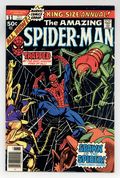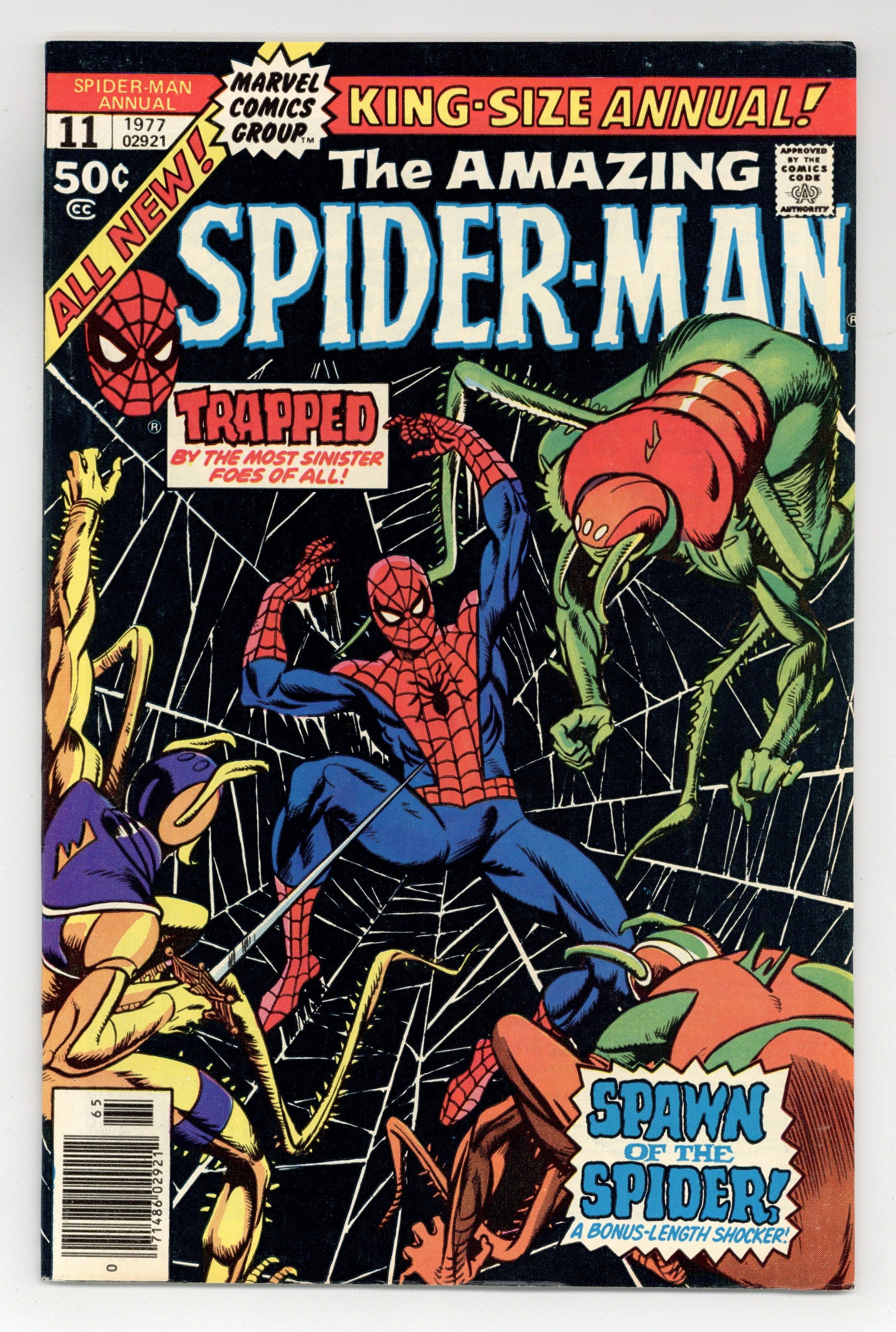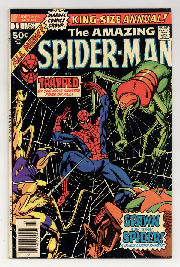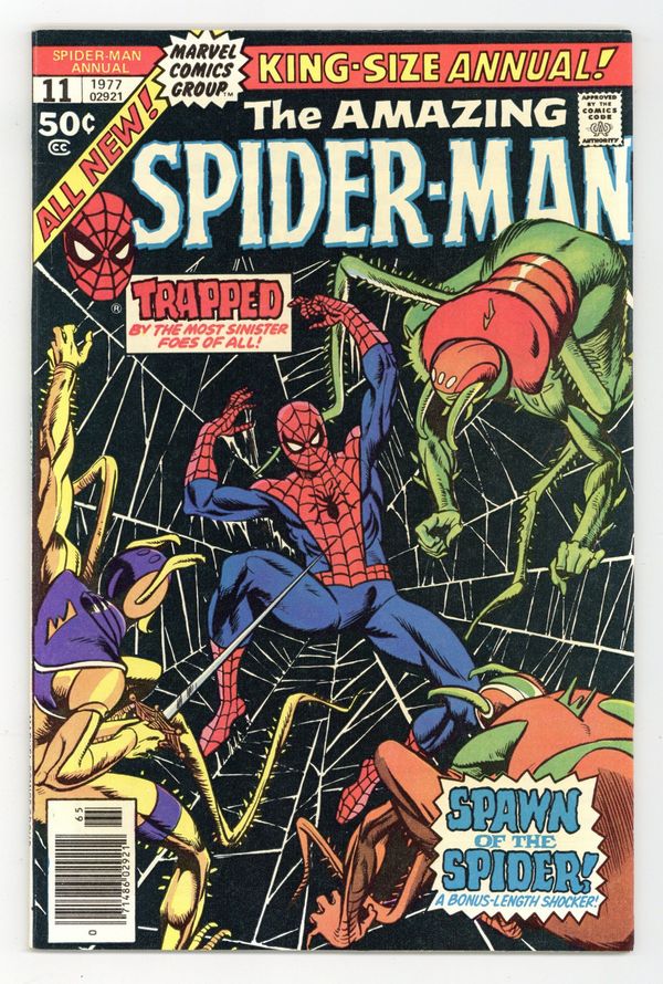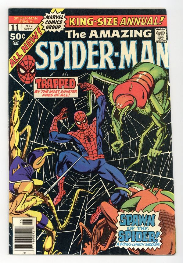 "Spawn of the Spider" Plot by Archie Goodwin. Script by Bill Mantlo. Pencils by Don Perlin. Inks by Jim Mooney. Cover by Gil Kane and Joe Sinnott. After posting bond for his dear Aunt May, Peter Parker needs money to pay his monthly rent! So in an unusual step, the web-slinger agrees to appear in a "B" movie featuring deadly spider-like monsters! However the amazing one doesn't know about the hostility among the director, producer, and costume designer! One of the three plans to sabotage the movie! And that means cancelling the act of its new star...Spider-Man! The twists and turns of the plot lead all the way to Yonkers! Where the battle between the wall-crawler and the Spider-Squad takes a front row seat! Cameo appearances by Mary Jane Watson, Anna Watson, and J. Jonah Jameson. Second story: "Chaos at the Coffee Bean!" Script by Scott Edelman. Pencils by John Romita Jr. (his first professional work). Inks by Al Milgrom. The Amazing Spider-Man foils a robbery at the Coffee Bean with Mary Jane by his side. 52 pages. Cover price $0.50.