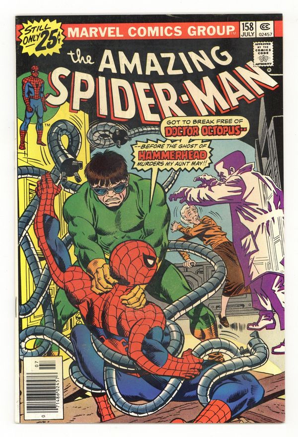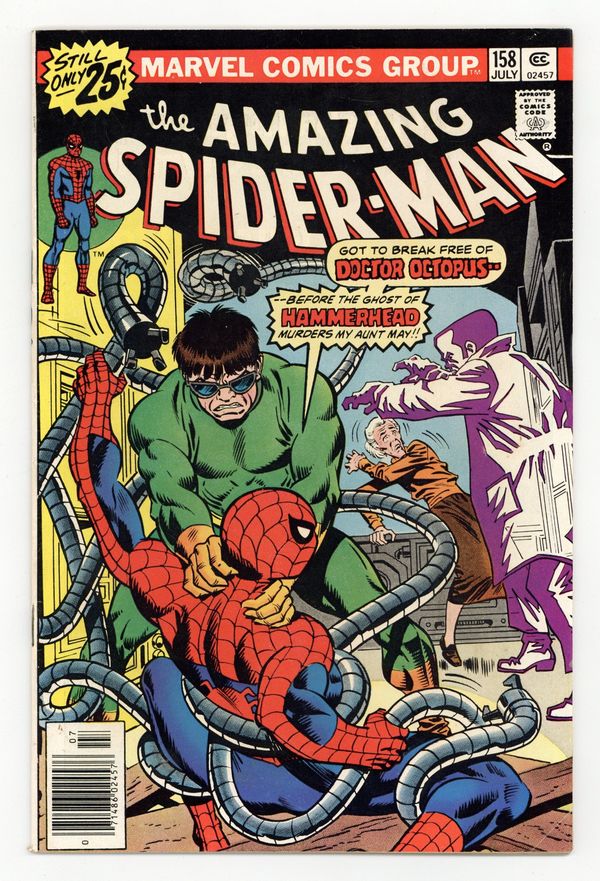 Tags: Marvel Legacy Numbering: Amazing Spider-Man (part 158), Spider-Man$15.75"Hammerhead is Out!" Part 2 of 3. Script by Len Wein. Pencils by Ross Andru. Inks by Mike Esposito. Cover by Ross Andru and Frank Giacoia. After surviving his free fall from the helicopter, the wondrous wall-crawler continues his pursuit of Dr. Octopus and Aunt May! The six-armed super-villain takes refuge at Brookhaven National Laboratory to draw Hammerhead's ghost into a deadly trap! But the sudden arrival of the web-slinger throws off Doc Ock's plan! Instead of destroying the ghost, Octopus' equipment returns Hammerhead to flesh and blood! And that sets the stage for the next issue's three-sided tussle: Doctor Octopus vs. Hammerhead vs. your friendly neighborhood Spider-Man! Cameo appearances by Mary Jane Watson, Glory Grant, Joe Robertson, and J. Jonah Jameson. (Notes: This issue contains a full-page ad for Hostess Twinkies featuring Captain America vs. the Red Skull. This story was reprinted in Marvel Tales 135. A 30-cent cover price variant exists for this issue.) 36 pages. Cover price $0.25.