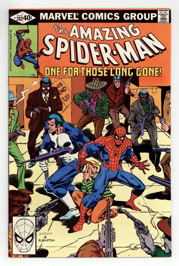 Direct Edition. "One for Those Long Gone!" Part 2 of 2. Guest-starring the Punisher. Script by Marv Wolfman. Art by Keith Pollard (breakdowns) and Jim Mooney (finishes). Cover by Keith Pollard and Joe Rubinstein. After surviving his nervous encounter with the Punisher, Peter Parker slips on his red and blue costume and joins the gun-toting vigilante's pursuit of the drug lords! Spider-Man wants to capture them. The Punisher wants to kill them. Something has got to give! Will the superhero or the anti-hero win the battle of wills? Cameo appearances by J. Jonah Jameson, Joe Robertson, and Dr. Jonas Harrow. (Notes: Spider-Man and the Punisher tangle again in Amazing Spider-Man Annual 15. This issue includes a sideways full-page ad featuring Batroc the Leaper promoting Crazy Magazine. This story was reprinted in Marvel Tales 219.) 36 pages Cover price $0.40.