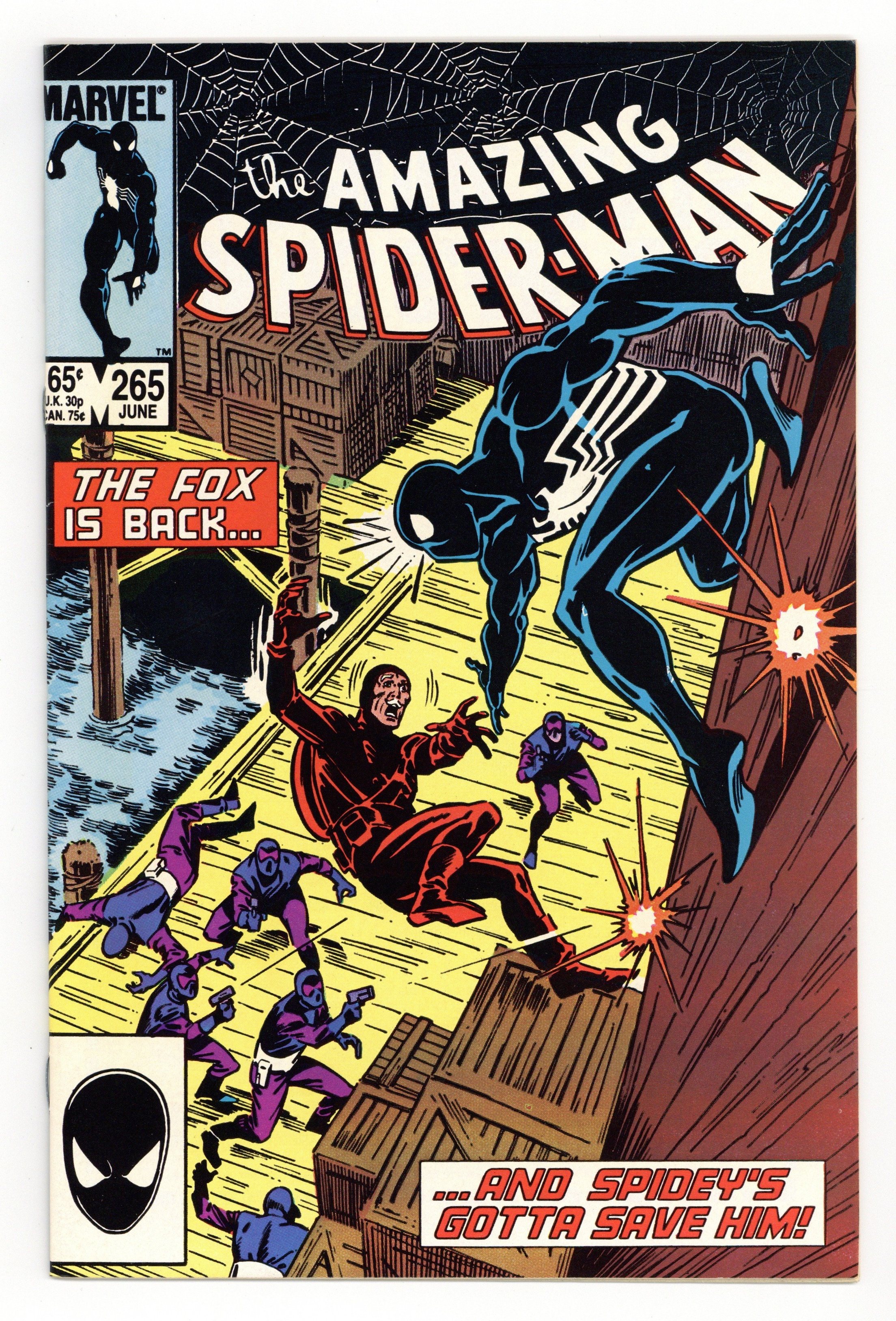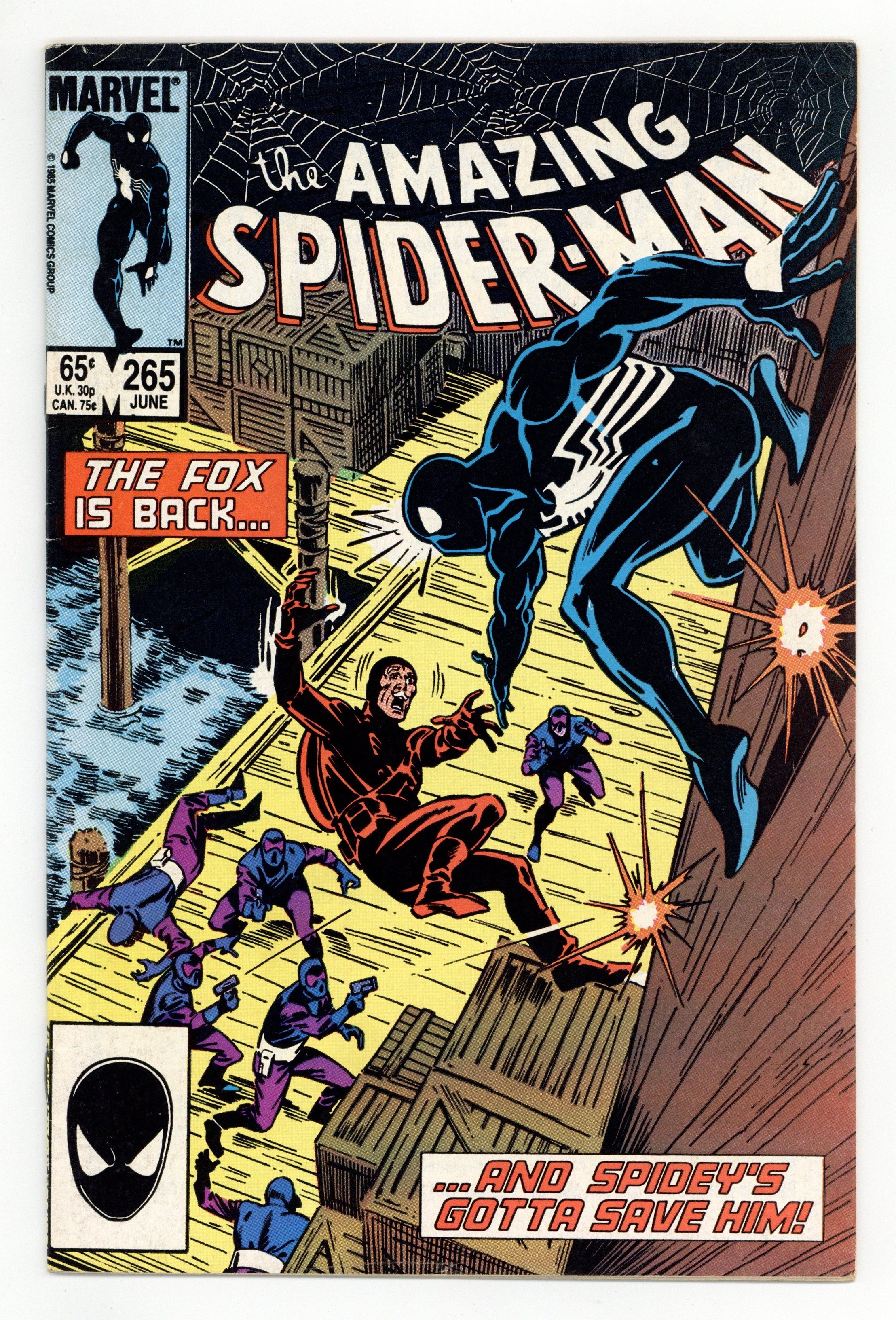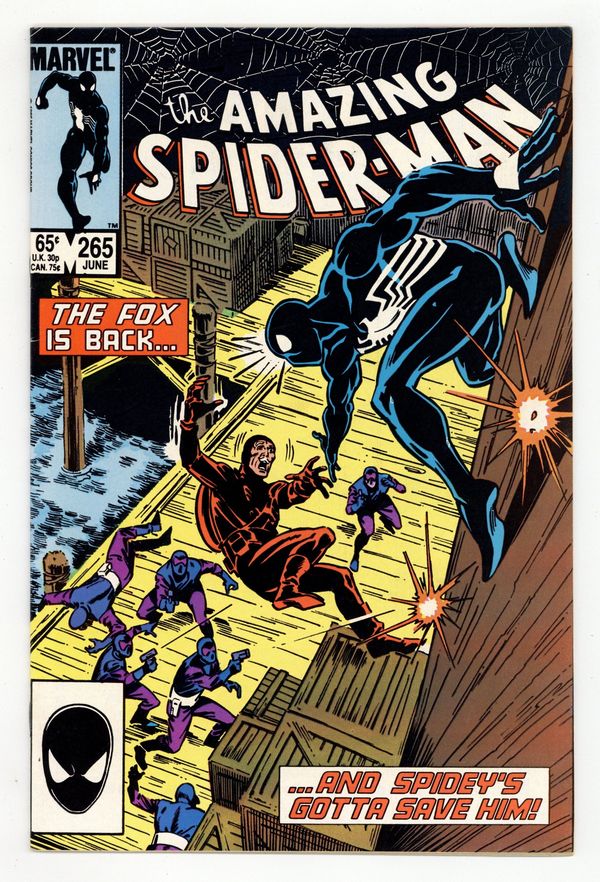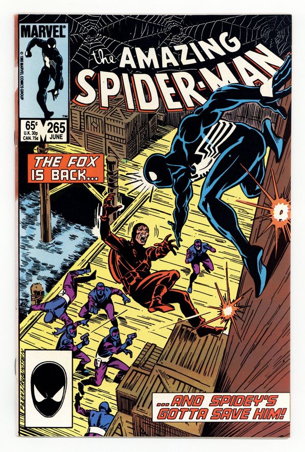 Tags: Marvel Legacy Numbering: Amazing Spider-Man (part 265), Spider-Man$24.50First printing. Direct Edition. First appearance of Silver Sable. Script by Tom DeFalco. Pencils by Ron Frenz. Inks by Joe Rubinstein. Cover by Ron Frenz and Joe Rubinstein. "After the Fox!". The Black Fox is on the run! But it's not the Spectacular Spider-Man who's chasing him! It's Silver Sable! An adventurer for hire from the European country of Symkaria! Silver Sable and her Wild Pack pursue the fox through the streets of Manhattan and then later corner him on the waterfront! However, the aging international jewel thief has a wall-crawling guardian angel! Down on the docks, the sparks fly as the web-slinger gives Silver Sable a lesson in diplomacy...superhero-style! Second appearance of the Black Fox. Cameo appearances by Aunt May, Mary Jane Watson, Harry Osborn, Liz Osborn, and Normie Osborn. (Notes: Silver Sable appears next in Amazing Spider-Man 279. The Black Fox returns in Web of Spider-Man 14. There is a second printing of this issue published in 1992. The second printing features a gray cover and a yellow dog ear touting the first appearance of Silver Sable. This story was also reprinted in Marvel Tales 277.) 36 pgs. Cover price $0.65.