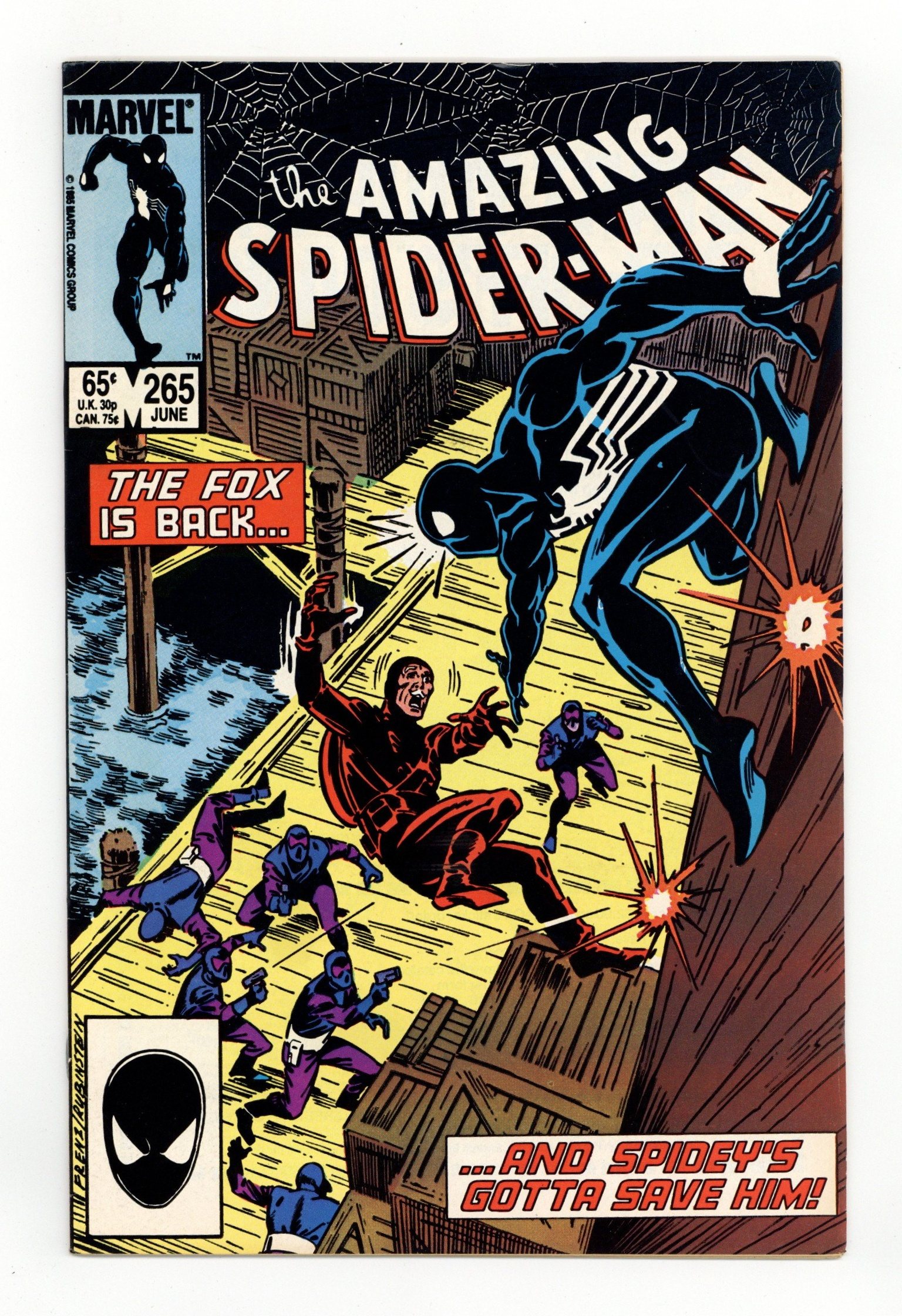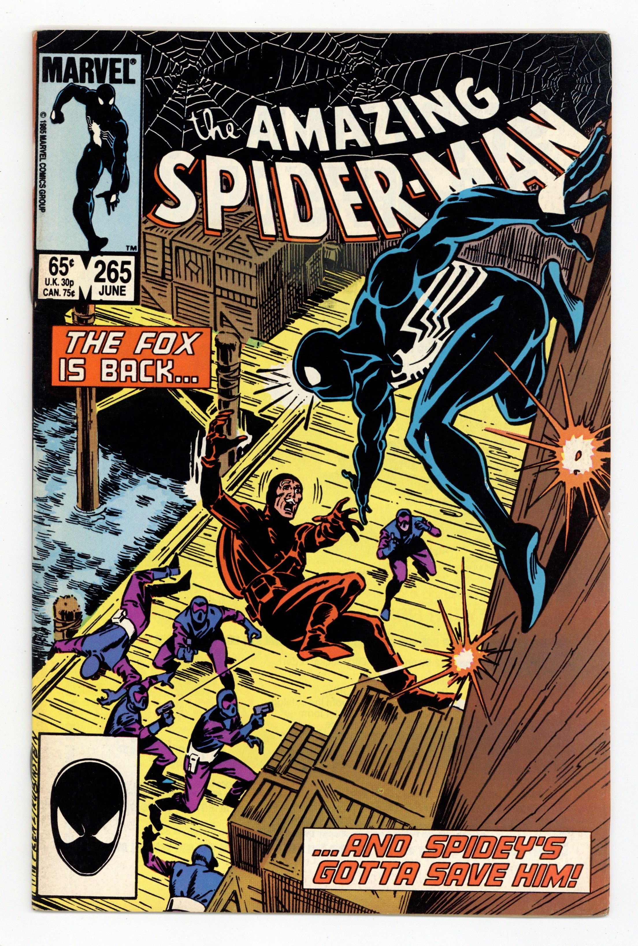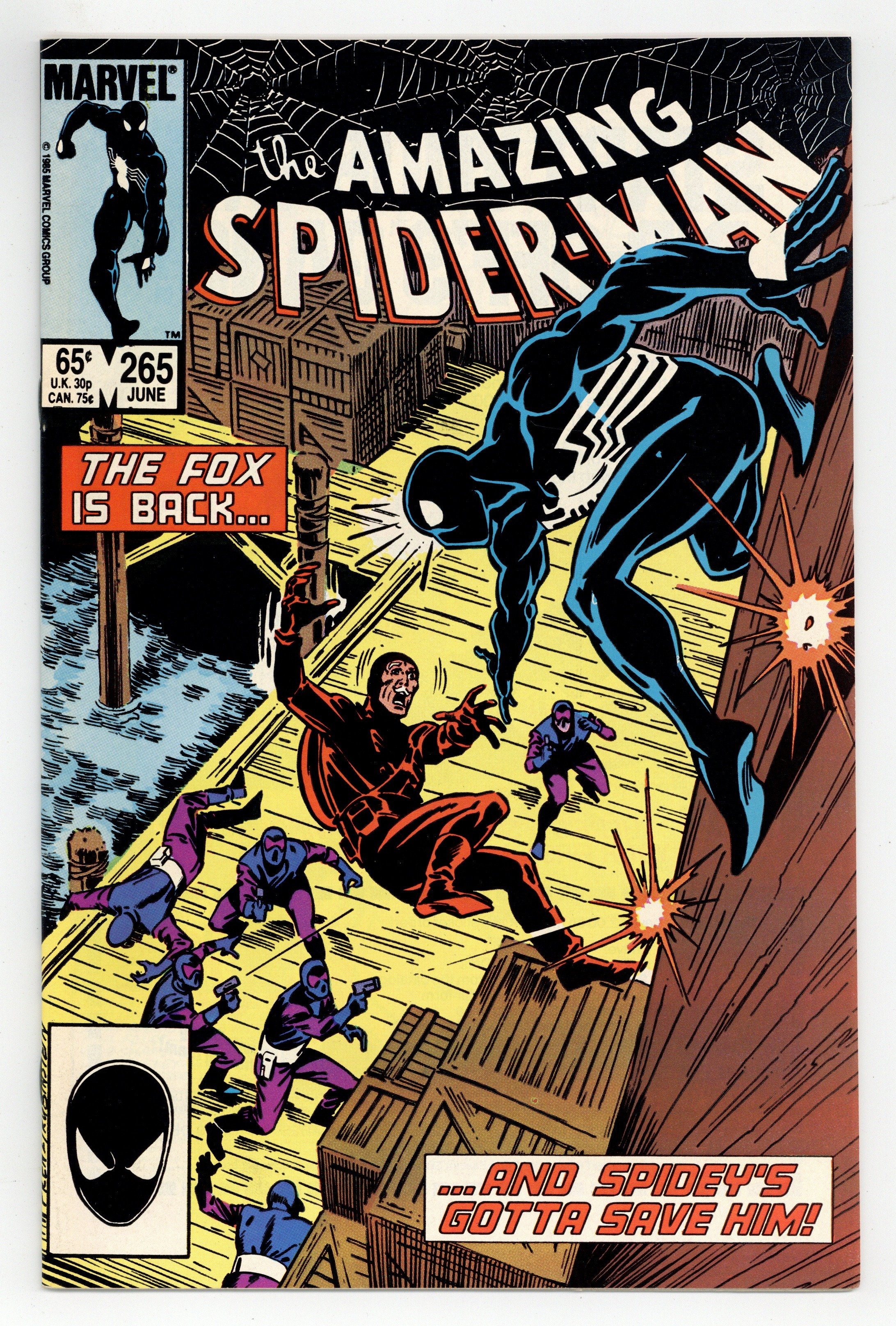 Tags: Marvel Legacy Numbering: Amazing Spider-Man (part 265), Spider-Man$24.50First printing. Direct Edition. First appearance of Silver Sable. Script by Tom DeFalco. Pencils by Ron Frenz. Inks by Joe Rubinstein. Cover by Ron Frenz and Joe Rubinstein. "After the Fox!". The Black Fox is on the run! But it's not the Spectacular Spider-Man who's chasing him! It's Silver Sable! An adventurer for hire from the European country of Symkaria! Silver Sable and her Wild Pack pursue the fox through the streets of Manhattan and then later corner him on the waterfront! However, the aging international jewel thief has a wall-crawling guardian angel! Down on the docks, the sparks fly as the web-slinger gives Silver Sable a lesson in diplomacy...superhero-style! Second appearance of the Black Fox. Cameo appearances by Aunt May, Mary Jane Watson, Harry Osborn, Liz Osborn, and Normie Osborn. (Notes: Silver Sable appears next in Amazing Spider-Man 279. The Black Fox returns in Web of Spider-Man 14. There is a second printing of this issue published in 1992. The second printing features a gray cover and a yellow dog ear touting the first appearance of Silver Sable. This story was also reprinted in Marvel Tales 277.) 36 pgs. Cover price $0.65.
