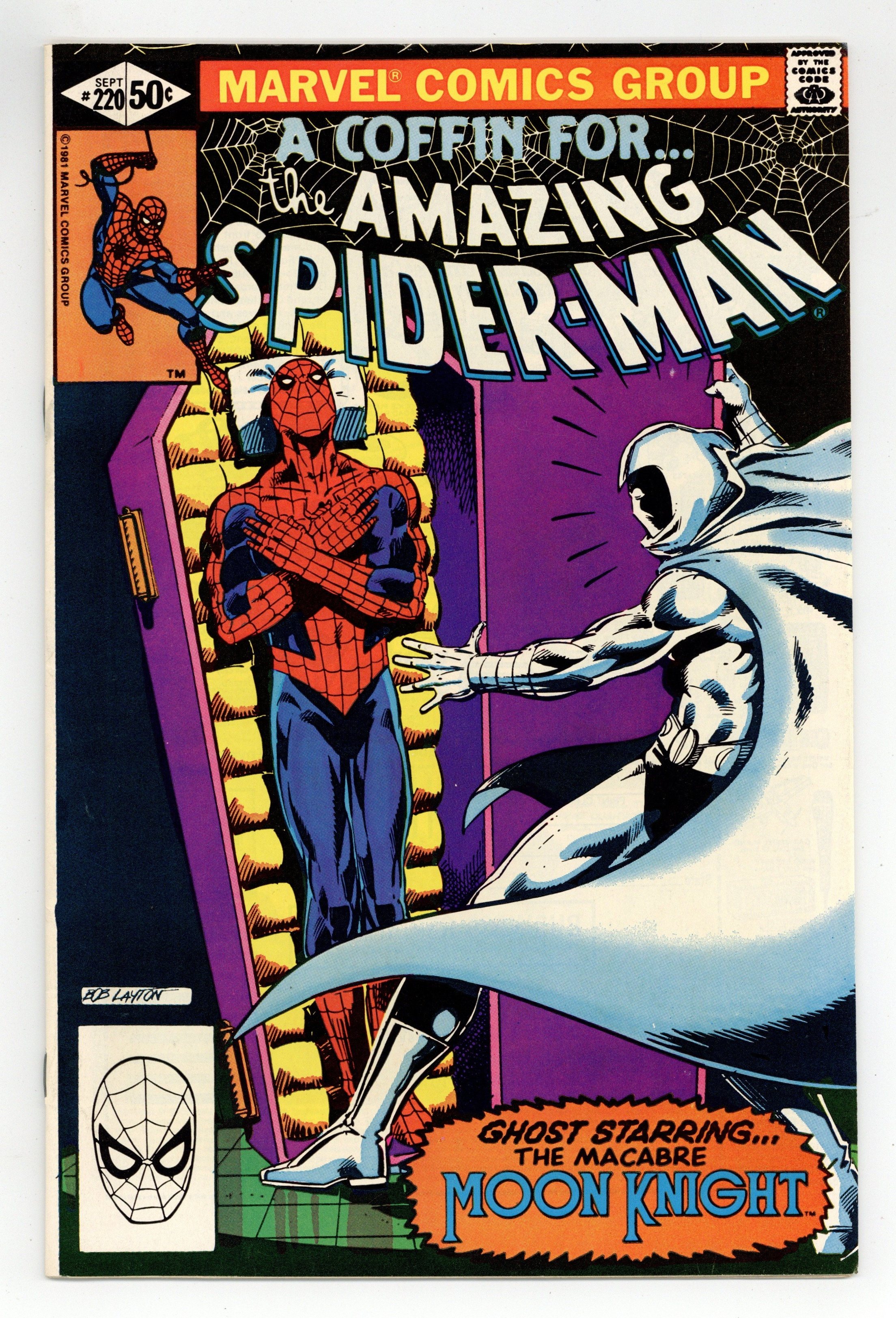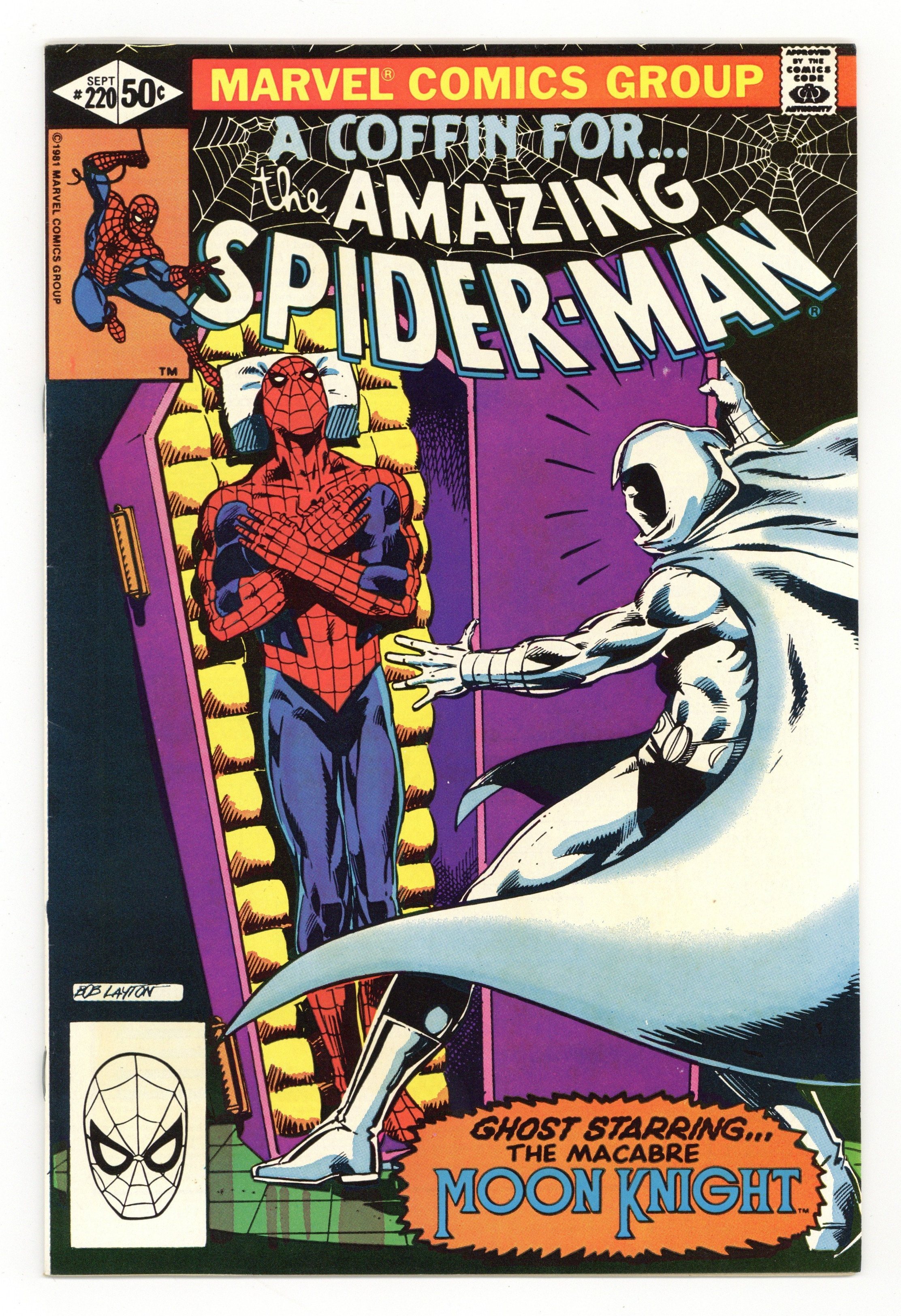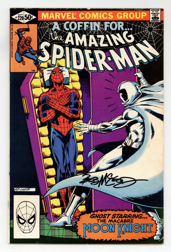 Direct Edition. "A Coffin for Spider-Man!" Guest-starring Moon Knight. Script by Michael Fleisher. Art by Bob McLeod. Cover by Bob Layton. A crime wave is sweeping across New York City! And the leader of the outbreak is Moon Knight! Hold on, isn't the knight one of the heroes in this town? That's what the web-slinger thought! At the Metropolitan Museum of Art, Spider-Man interrupts Moon Knight's next heist! But then he helps his lunar adversary escape! Is the wall-crawler joining or stopping the (crime) wave? Cameo appearances by J. Jonah Jameson and Frenchie. Second story: "The Nursing Home Caper" Script by Mike W. Barr. Art by Win Mortimer. With quick thinking Aunt May stops a robbery at her nursing home. Cameo appearances by Anna Watson and Spider-Man. (Note: The web-slinger and Moon Knight previously met in Spectacular Spider-Man 22 & 23 and Marvel Team-Up Annual 4.) 36 pages. 50 cent cover price. Cover price $0.50.