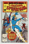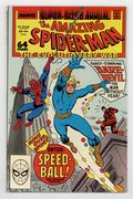 $9.50"Drug War Rages" Guest-starring Daredevil and Speedball. Part 5 of the Evolutionary War storyline. First appearance of Speedball. Plot by Tom DeFalco. Script by David Michelinie. Pencils by Mark Bagley. Inks by Mike Esposito. Cover by Ron Frenz and Joe Rubinstein. What begins as a simple drug bust in a west side warehouse...escalates into a battle atop the Empire State Building to save the lives of everyone in the Big Apple! Along the way the Amazing Spider-Man teams up with a familiar ally, the Man Without Fear; and meets a new superhero: Speedball (aka Robbie Baldwin)! The High Evolutionary wants to sterilize New York's population to eradicate DNA strands deemed to be undesirable! Can the web-slinger, Daredevil, and Speedball defeat the Purifiers and maintain the gene pool status quo? The Evolutionary War storyline continues in Fantastic Four Annual 21. Appearances by the Kingpin, Arranger, Madeline Naylor, Mary Jane Watson, Ben Urich, and J. Jonah Jameson. First backup story: "He Who Laughs..." Plot by Steve Ditko. Script by Roger Stern. Pencils by Steve Ditko. Inks by Jackson Guice. Speedball battles a crazy stagehand seeking revenge against his mother. Second backup story: "Kindred Spirits" Story by Mark Gruenwald. Pencils by Ron Lim. Inks by Tony DeZuniga. Chapter 6 of the High Evolutionary's history. Inside his Wundagore Mountain citadel, Edgar Wyndham creates Bova -- the future nanny of Quicksilver and the Scarlet Witch; and foolishly ignores Magnus' warning that the spirit of Chthon is bound to Wundagore Mountain. First backup feature: Spider-Man and J. Jonah Jameson pin-up by Larry Lieber and Frank Giacoia. Second backup feature: 2-page diagram of Peter and Mary Jane's Bedford Towers apartment. Third backup feature: Two unpublished Amazing Spider-Man covers -- the first by Larry Lieber & Jack Abel; the second by Bob Layton. (Note: Fantastic Four Annual 21 is the 6th part of the Evolutionary War storyline, but the 5th chapter of the history presented in the backup stories.) 68 pages. Cover price $1.75.