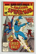 $8.30"Drug War Rages" Guest-starring Daredevil and Speedball. Part 5 of the Evolutionary War storyline. First appearance of Speedball. Plot by Tom DeFalco. Script by David Michelinie. Pencils by Mark Bagley. Inks by Mike Esposito. Cover by Ron Frenz and Joe Rubinstein. What begins as a simple drug bust in a west side warehouse...escalates into a battle atop the Empire State Building to save the lives of everyone in the Big Apple! Along the way the Amazing Spider-Man teams up with a familiar ally, the Man Without Fear; and meets a new superhero: Speedball (aka Robbie Baldwin)! The High Evolutionary wants to sterilize New York's population to eradicate DNA strands deemed to be undesirable! Can the web-slinger, Daredevil, and Speedball defeat the Purifiers and maintain the gene pool status quo? The Evolutionary War storyline continues in Fantastic Four Annual 21. Appearances by the Kingpin, Arranger, Madeline Naylor, Mary Jane Watson, Ben Urich, and J. Jonah Jameson. First backup story: "He Who Laughs..." Plot by Steve Ditko. Script by Roger Stern. Pencils by Steve Ditko. Inks by Jackson Guice. Speedball battles a crazy stagehand seeking revenge against his mother. Second backup story: "Kindred Spirits" Story by Mark Gruenwald. Pencils by Ron Lim. Inks by Tony DeZuniga. Chapter 6 of the High Evolutionary's history. Inside his Wundagore Mountain citadel, Edgar Wyndham creates Bova -- the future nanny of Quicksilver and the Scarlet Witch; and foolishly ignores Magnus' warning that the spirit of Chthon is bound to Wundagore Mountain. First backup feature: Spider-Man and J. Jonah Jameson pin-up by Larry Lieber and Frank Giacoia. Second backup feature: 2-page diagram of Peter and Mary Jane's Bedford Towers apartment. Third backup feature: Two unpublished Amazing Spider-Man covers -- the first by Larry Lieber & Jack Abel; the second by Bob Layton. (Note: Fantastic Four Annual 21 is the 6th part of the Evolutionary War storyline, but the 5th chapter of the history presented in the backup stories.) 68 pages. Cover price $1.75.