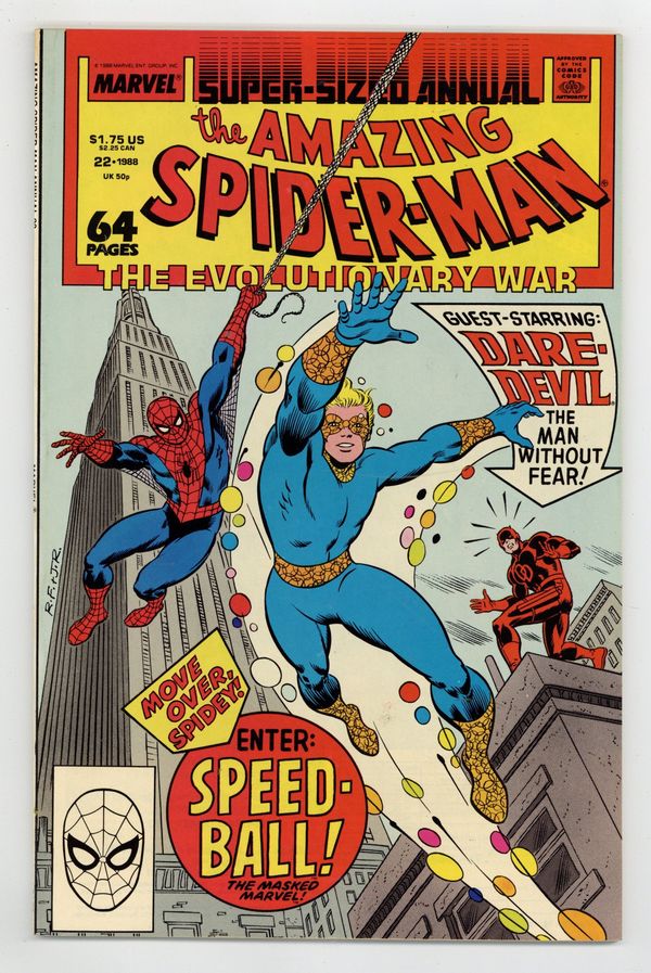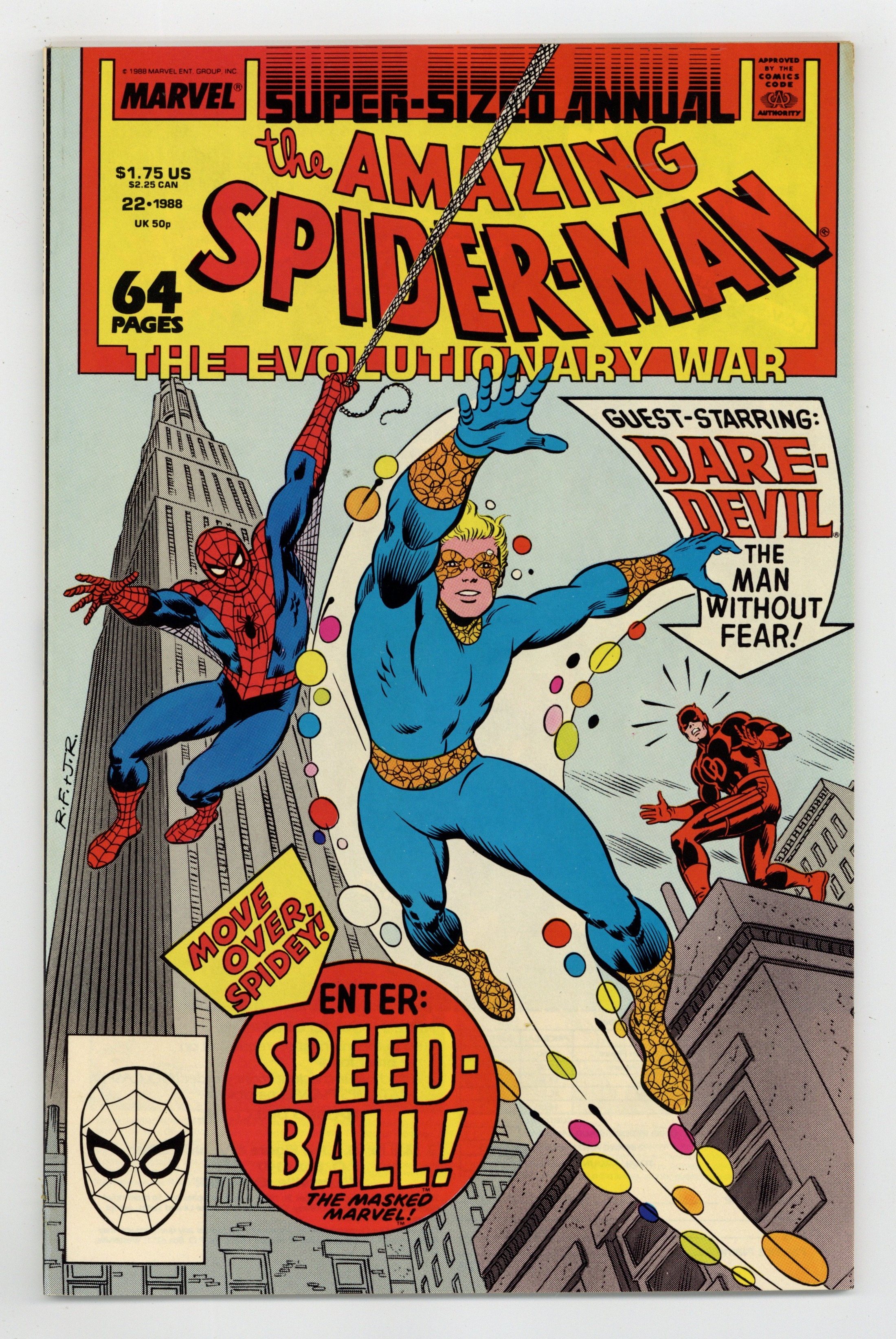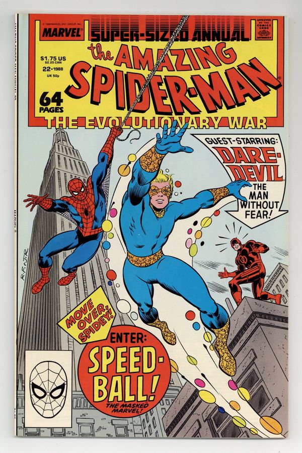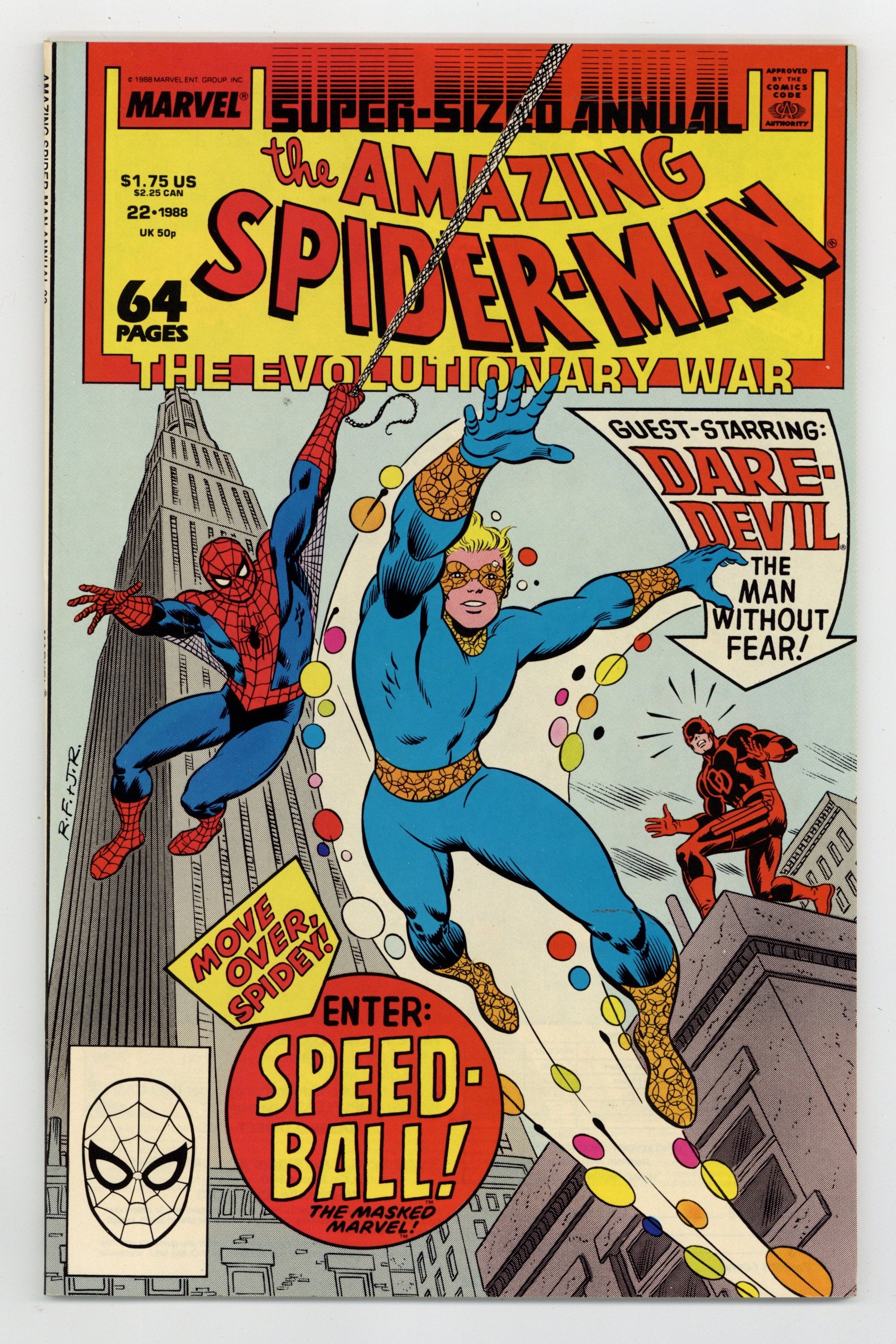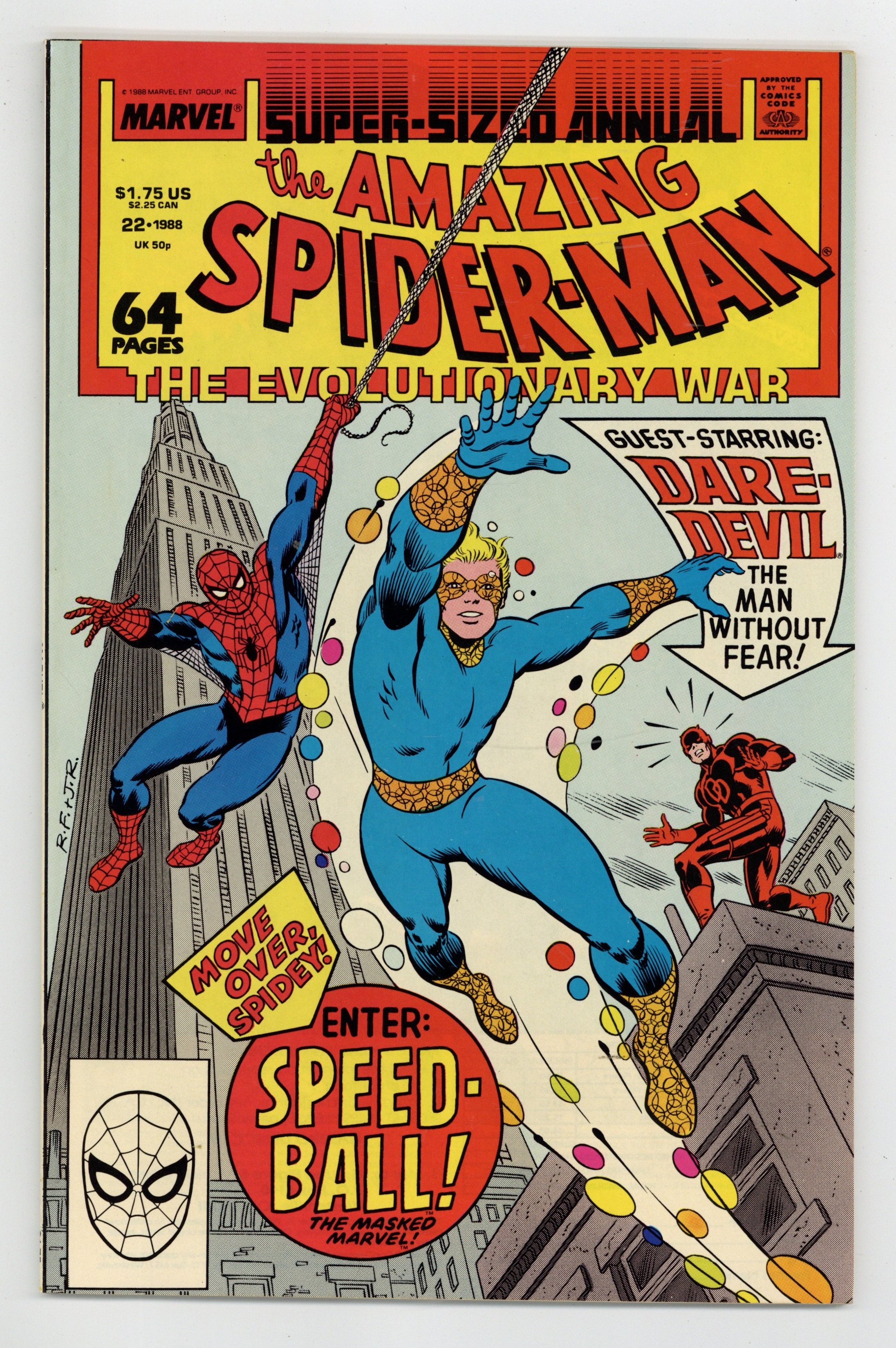 $14.50"Drug War Rages" Guest-starring Daredevil and Speedball. Part 5 of the Evolutionary War storyline. First appearance of Speedball. Plot by Tom DeFalco. Script by David Michelinie. Pencils by Mark Bagley. Inks by Mike Esposito. Cover by Ron Frenz and Joe Rubinstein. What begins as a simple drug bust in a west side warehouse...escalates into a battle atop the Empire State Building to save the lives of everyone in the Big Apple! Along the way the Amazing Spider-Man teams up with a familiar ally, the Man Without Fear; and meets a new superhero: Speedball (aka Robbie Baldwin)! The High Evolutionary wants to sterilize New York's population to eradicate DNA strands deemed to be undesirable! Can the web-slinger, Daredevil, and Speedball defeat the Purifiers and maintain the gene pool status quo? The Evolutionary War storyline continues in Fantastic Four Annual 21. Appearances by the Kingpin, Arranger, Madeline Naylor, Mary Jane Watson, Ben Urich, and J. Jonah Jameson. First backup story: "He Who Laughs..." Plot by Steve Ditko. Script by Roger Stern. Pencils by Steve Ditko. Inks by Jackson Guice. Speedball battles a crazy stagehand seeking revenge against his mother. Second backup story: "Kindred Spirits" Story by Mark Gruenwald. Pencils by Ron Lim. Inks by Tony DeZuniga. Chapter 6 of the High Evolutionary's history. Inside his Wundagore Mountain citadel, Edgar Wyndham creates Bova -- the future nanny of Quicksilver and the Scarlet Witch; and foolishly ignores Magnus' warning that the spirit of Chthon is bound to Wundagore Mountain. First backup feature: Spider-Man and J. Jonah Jameson pin-up by Larry Lieber and Frank Giacoia. Second backup feature: 2-page diagram of Peter and Mary Jane's Bedford Towers apartment. Third backup feature: Two unpublished Amazing Spider-Man covers -- the first by Larry Lieber & Jack Abel; the second by Bob Layton. (Note: Fantastic Four Annual 21 is the 6th part of the Evolutionary War storyline, but the 5th chapter of the history presented in the backup stories.) 68 pages. Cover price $1.75.