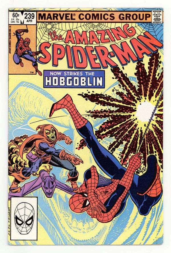 Direct Edition. "Now Strikes the Hobgoblin!" Second appearance of the Hobgoblin. Script by Roger Stern. Art by John Romita Jr. (breakdowns) and Frank Giacoia (finishes). Cover by John Romita Jr. and Al Milgrom. It's the first fight between the Hobgoblin and the Amazing Spider-Man! And the all-out action begins after the web-slinger bumps into the new goblin at one of Norman Osborn's old hideouts! Spidey is very familiar with the goblin's bag of tricks! But the overmatched Hobgoblin doesn't have any idea about the wall-crawler's speed, strength, and agility! Is the Hobgoblin's criminal career going to be over before it even starts? An outstanding issue! Cameo appearances by Harry Osborn, Madame Web, Captain DeWolff, and the Black Cat. (Notes: The Hobgoblin returns in Amazing Spider-Man 244. This issue was reprinted in Marvel Tales 258.) 36 pages. Cover price $0.60.