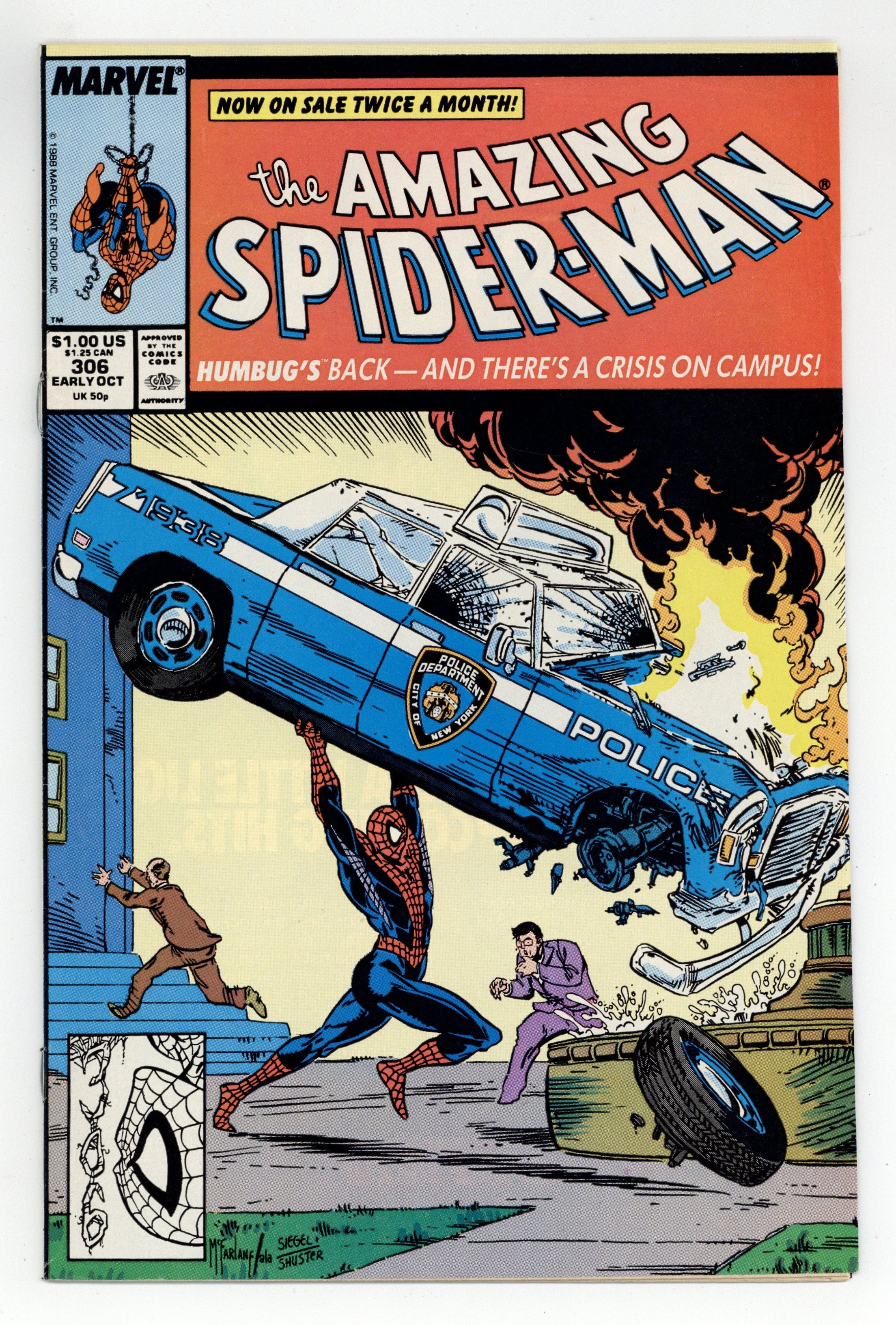 Tags: Marvel Legacy Numbering: Amazing Spider-Man (part 306), Spider-Man$38.00Direct Edition. "Humbugged!" Script by David Michelinie. Art by Todd McFarlane. Cover by Todd McFarlane. The pesky Humbug is back! And the insect-infatuated villain wants to resume his research on the ESU campus! But the crazy entomologist runs into his most-reviled insect first: the Spectacular Spider-Man! Let the extermination begin! Meanwhile at Bedford Towers, Peter and Mary Jane's neighbor, Jonathon Caesar, is acting stranger and stranger...perhaps even a bit obsessive! Cameo appearances by the Chameleon, Aunt May, and the Black Cat. (Notes: The Humbug previously appeared in Web of Spider-Man 19. McFarlane's cover is a tribute to the 50th anniversary of Superman and the cover of Action Comics #1.) 36 pgs. Cover price $1.00.
