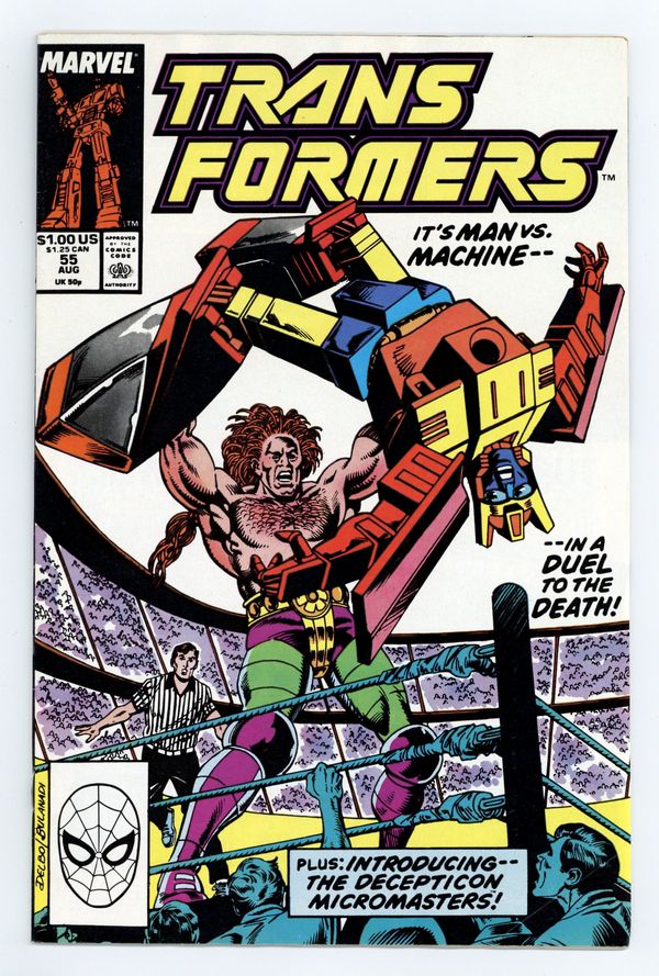 Tags: Transformers$23.50Direct Edition. It's man vs. machine...in a duel to the death! Plus, introducing the Decepticon Micromasters! Written by Bob Budiansky, with art by Bob Budiansky, Jim Fern and Mike Gustovich. Cover by Jose Delbo and Danny Bulanadi. Cover price $1.00.