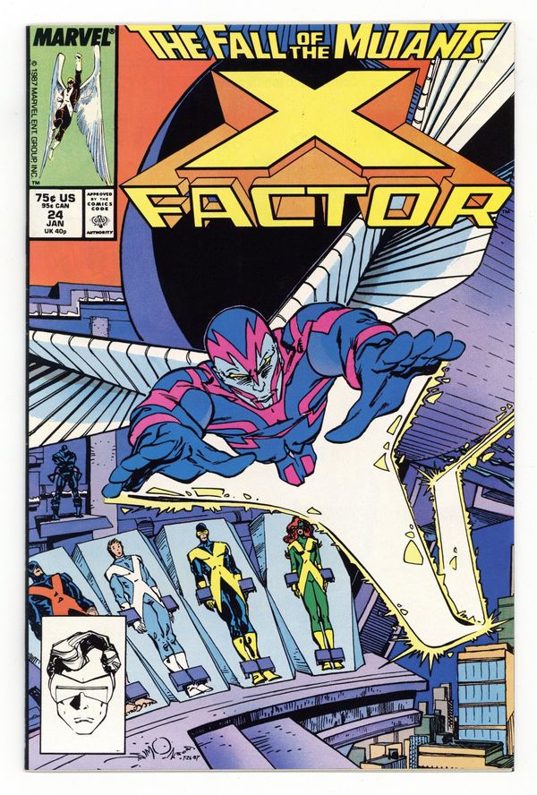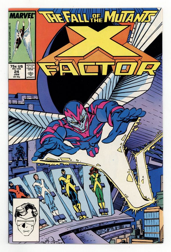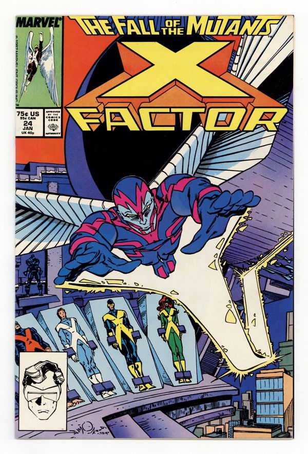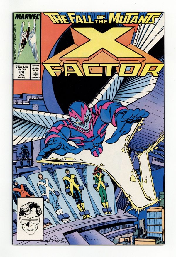 Direct Edition. Fall of the Mutants! Part 1 of 3. "Masks!" 1st full appearance of Archangel. Story by Louise Simonson. Art by Walter Simonson and Bob Wiacek. One of the biggest mutant events to ever hit the comic racks begins here. The powerful mutant known as Apocalypse finally makes his move and unleashes his Four Horseman on an unsuspecting world. The only thing standing between humanity and total annihilation is X-Factor. However when the fourth and final Horseman, Death, reveals his true identity, the group will be rocked to its very core. This is a pivotal chapter in the lives of the original X-Men. Cover price $0.75.