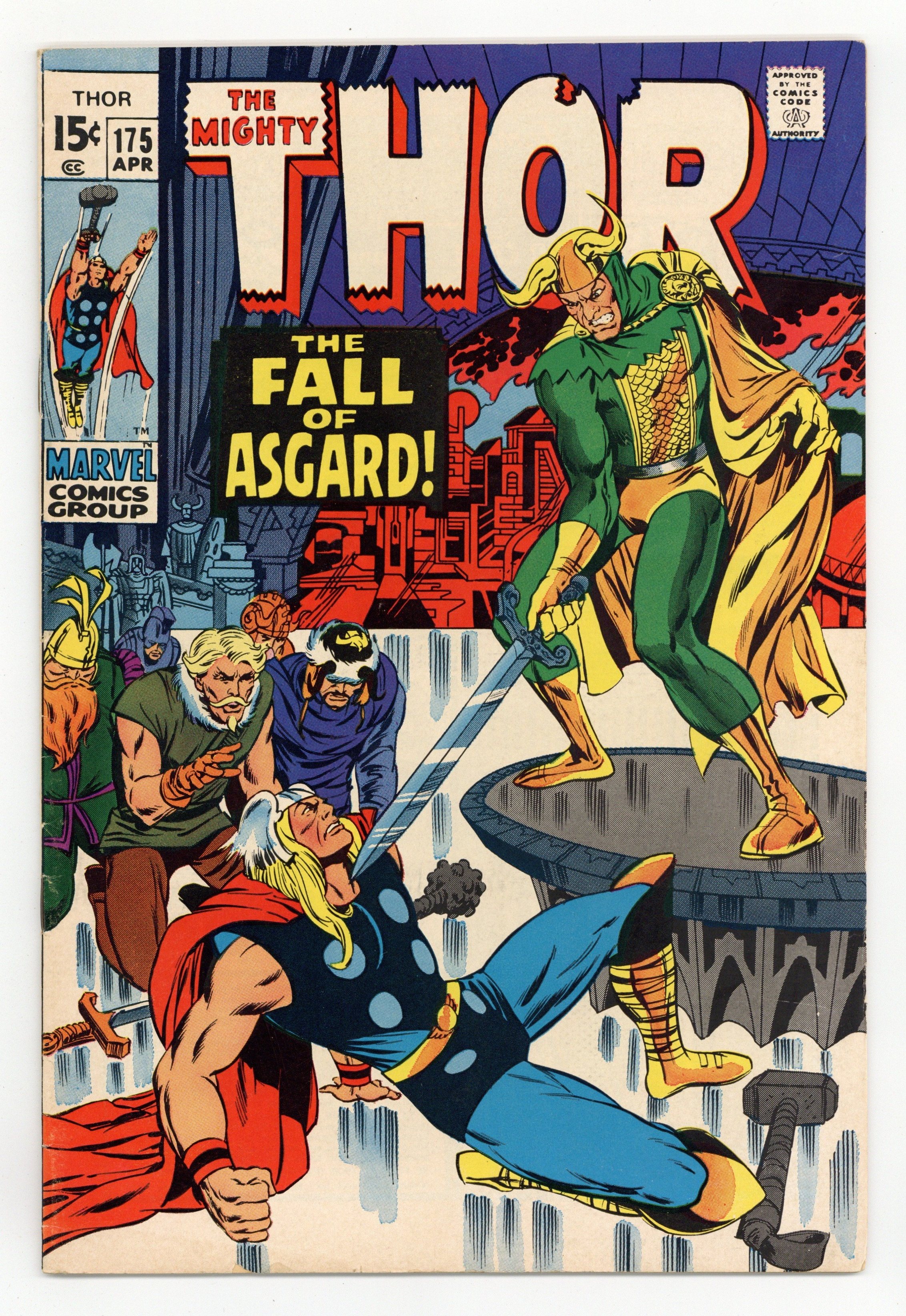 Tags: Marvel Legacy Numbering: Thor (part 175), Thor$15.50Cover pencils by Marie Severin. Loki returns in "The Fall of Asgard!", script by Stan Lee, pencils by Jack Kirby, inks by Bill Everett; When a series of truck hijackings have been hitting the city, the police employ the help of Thor to round up the thieves by setting a trap for them, which with the aid of the Thunder God lands an easy capture; While in the land of the Norns, Balder and the Warriors Three have recovered from their injuries and pay their leave to Karnilla; Balder and Karnilla have another exchange about how Balder cannot give up his loyalty to Asgard and love Karnilla and the quartet depart; Haag taunts Karnilla over her softness toward Balder and is chased out of the room; Thor attempts to rally the people of Asgard to overthrow Loki. 36 pgs., full color. $0.15. Cover price $0.15.