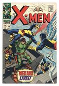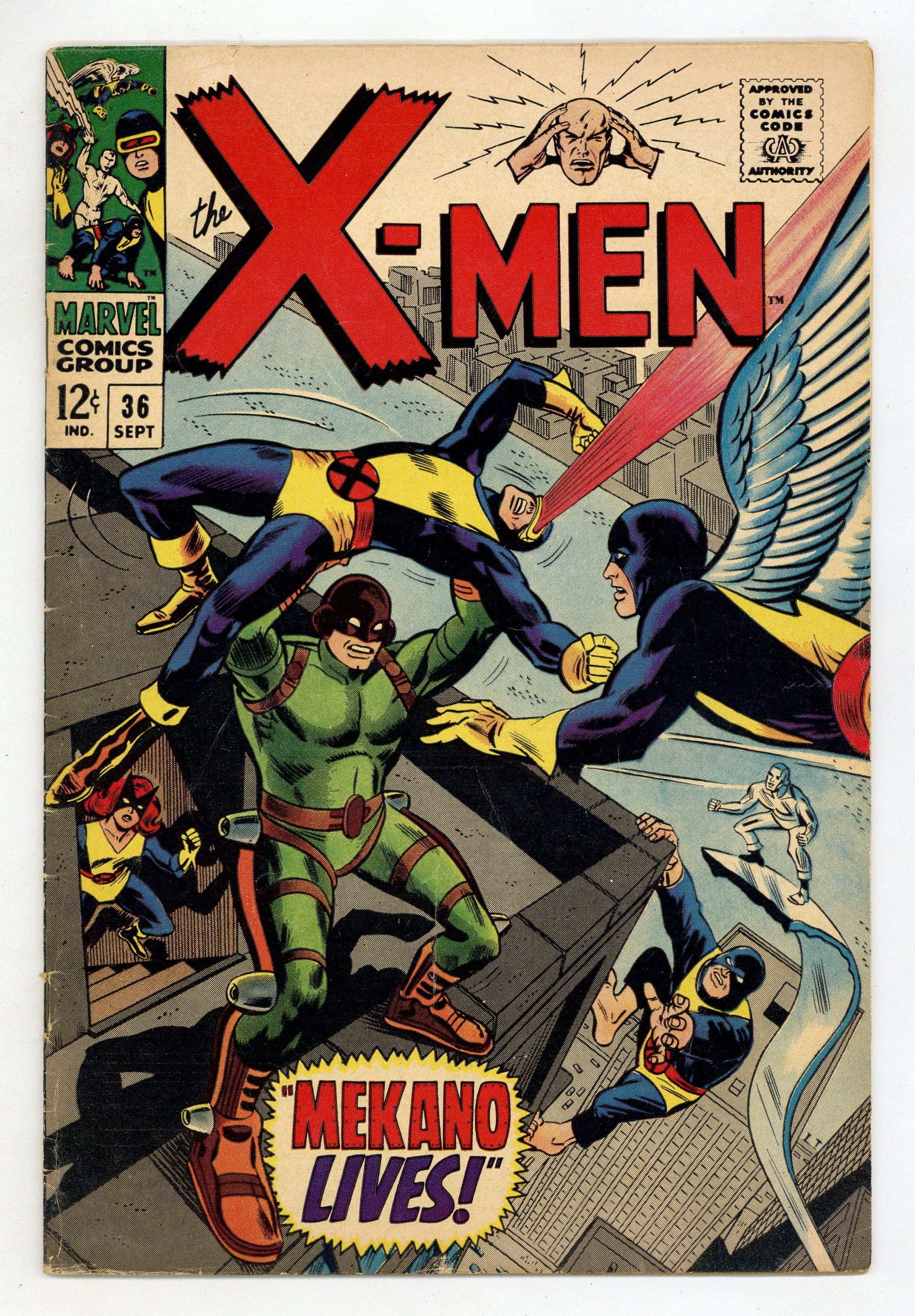 Cover pencils by Ross Andru, inks by George Roussos. Mekano Lives!, script by Roy Thomas, pencils by Ross Andru, inks by George Roussos [as George Bell]; the X-Men try to make money to go to Europe, where the Factor Three is; they battle Mekano and save the Central Library; First full appearance of Merkano. 36 pgs. $0.12. Cover price $0.12.