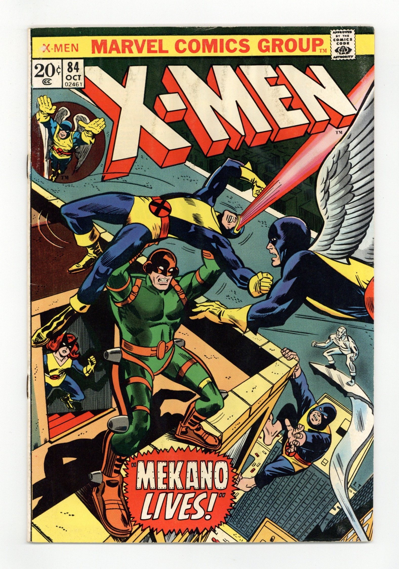 Cover pencils by Ross Andru, inks by George Roussos. Mekano Lives, script by Roy Thomas, pencils by Ross Andru, inks by George Roussos; the X-Men try to make money to go to Europe, where the Factor Three is; they battle Mekano and save the Central Library; reprinted from issue 36. 36 pgs. $0.20. Cover price $0.20.