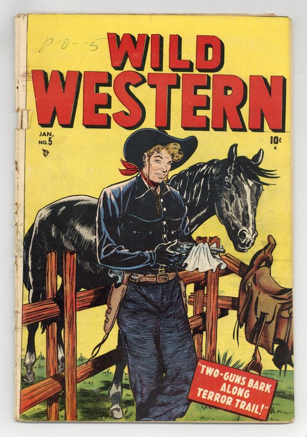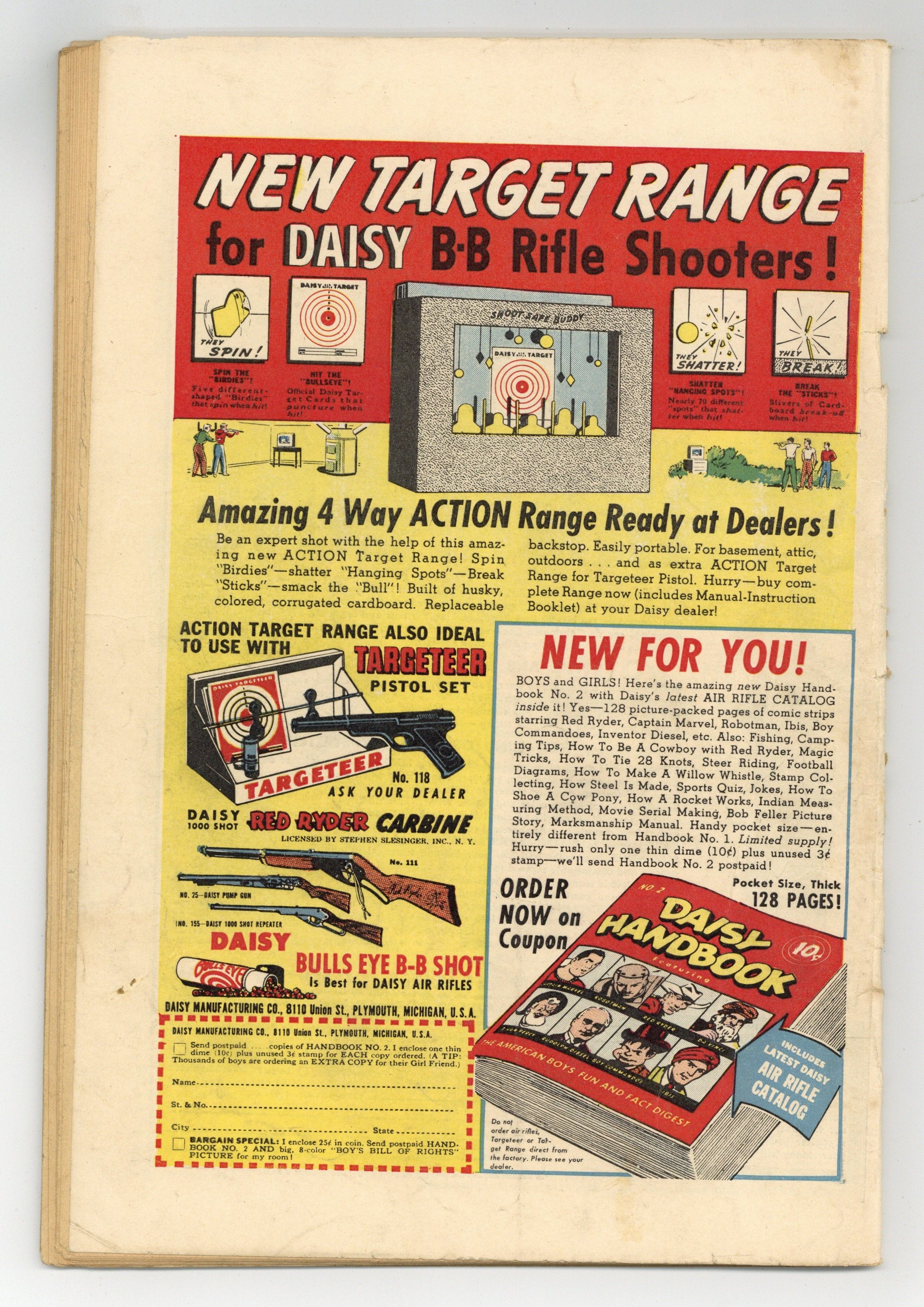 Two-Gun Kid stars in "Two Guns Bark Along Terror Trail." The Black Rider stars in "Lead Law in Leadville." Kid Colt Outlaw stars in "Flashing Steel of Doom." Tex Taylor stars in "Ride the Rustlers Down." Blaze Carson stars in "Colt-Crazy Maverick." Syd Shores art. Captain Tootsie stars in a Tootsie Roll ad, "The Babe Ruth Story" (art by C.C. Beck). Shores cover. Cover price $0.10.