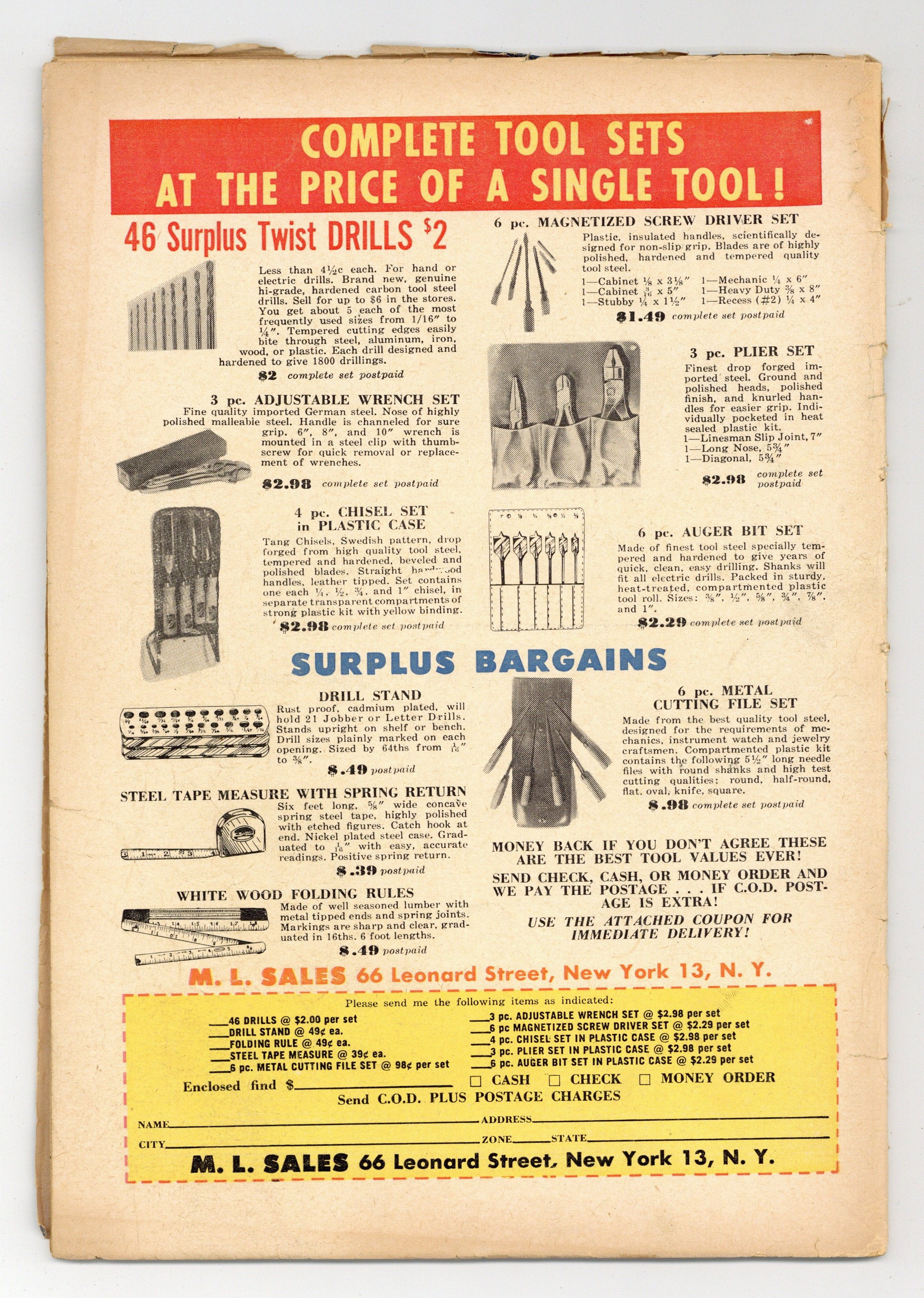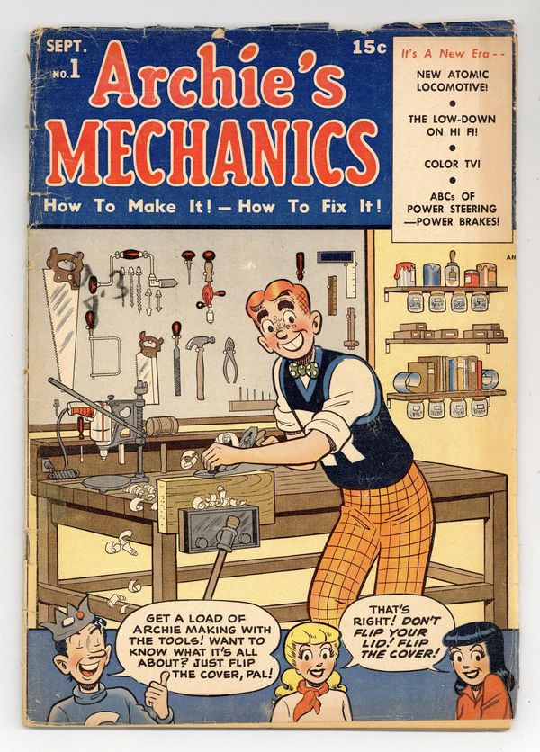 Join Archie and his crew in "How To Make It! - How To Fix It!" Archie's Mechanics No.1 from Sept., 1954. This nifty comic book, with the help of Archie Andrews, Betty, Veronica, and even Jughead, shows you the "mechanics" of a wide range of "new era" things including a new atomic locomotive, the low-down on hi-fi, color TV, plus the "ABC's of power steering and power brakes!" Inside this 52-page issue, learn "What's Inside a Baseball," "The Pitch on Bike Care," "How to take Better Summer Photos," and much more! Cover price $0.15.