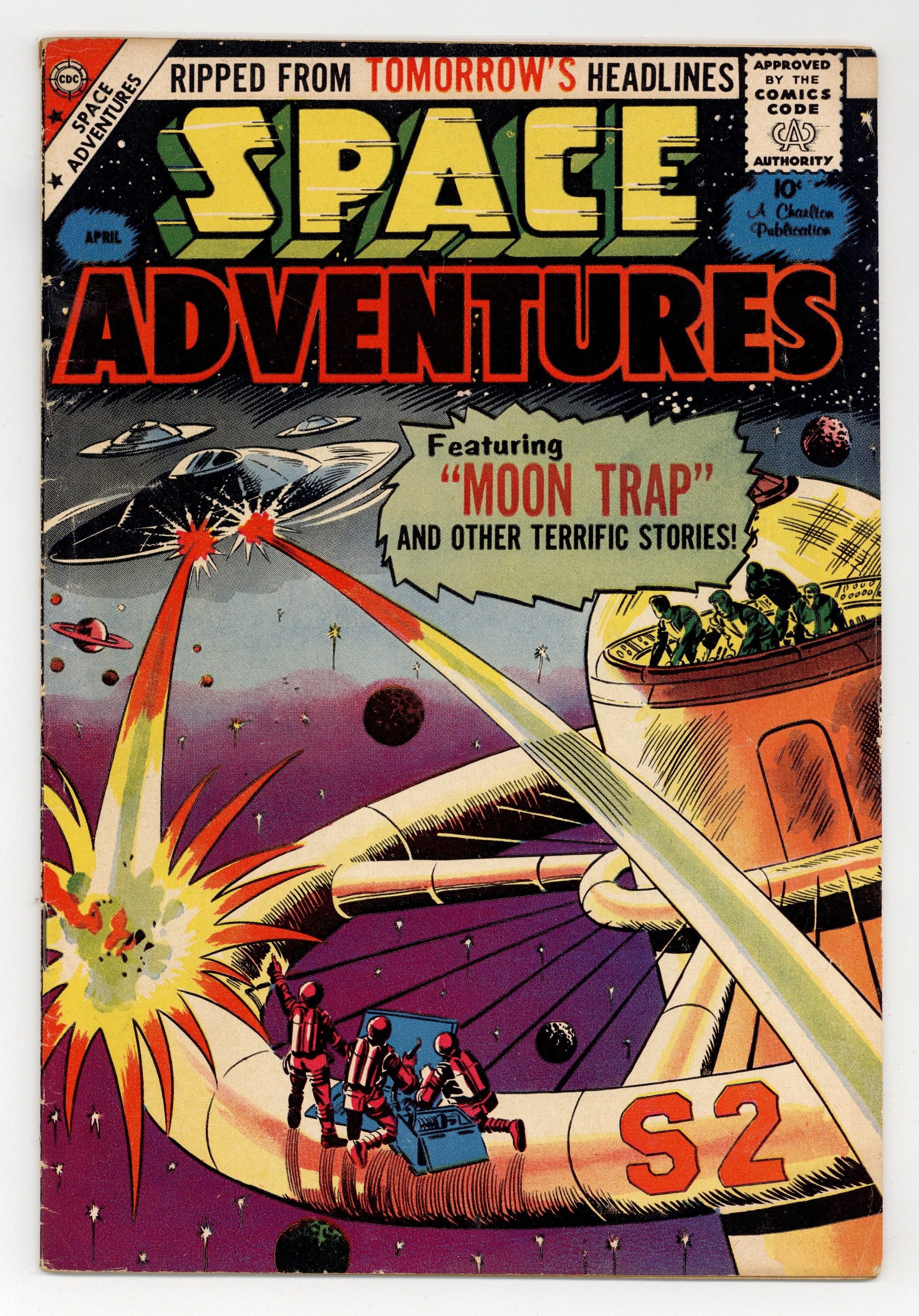 Cover by Bill Molno and Vince Alascia. Stories and art by Matt Baker, Vince Colletta, Charles Nicholas, Sal Trapani, Bill Molno and Ernie Hart. Sci-fi and super-heroics from Charlton Comics. A macho astronaut and his wimpy brother crash-land on the Moon and are captured by a space pirate, in a story featuring early art by comics legend Matt Baker. Aliens return to Earth after thousands of years to reclaim their ancient idol, New Hampshire's Old Man of the Mountain. A scientist discovers that alien "Galactites" have invaded the Earth, disguised as ordinary humans. Plus a vintage ad for a replica hand grenade. Moon Trap; Visitor from the Void; Space Shift; An Idol of Their Own; The Invaders. 32 pages, Full Color. Cover price $0.10.