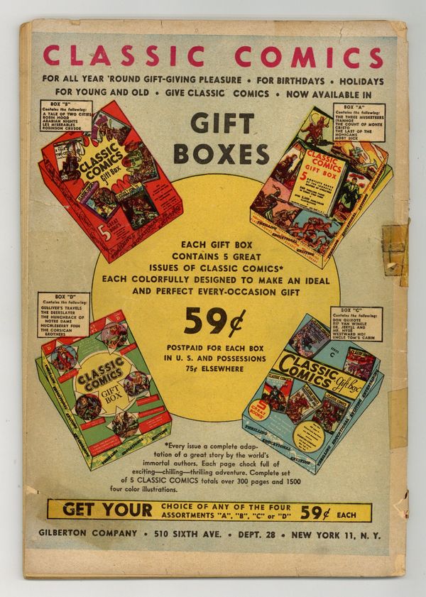 Published Jan 1947 by Classics Illustrated.$55.00- 5" Cumulative spine split. Cover oxidation. Tape and glue on interior cover.
