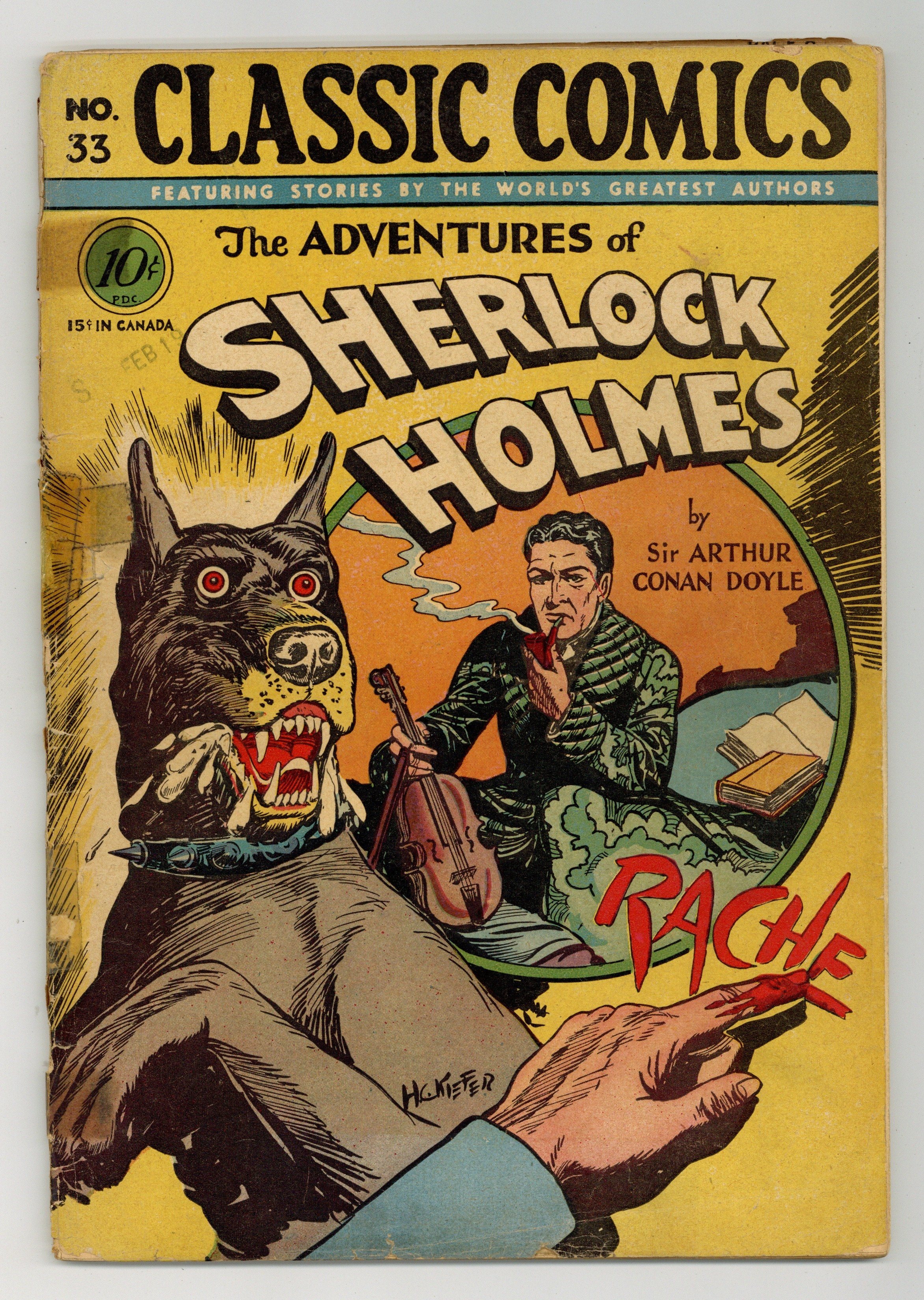 Adventures of Sherlock Holmes, 1st Printing, Classics Comics. Kiefer cover, contains Hound of the Baskervilles & A Study in Scarlet, 68 pgs. (HRN 33, 1/47). Cover price $0.10.