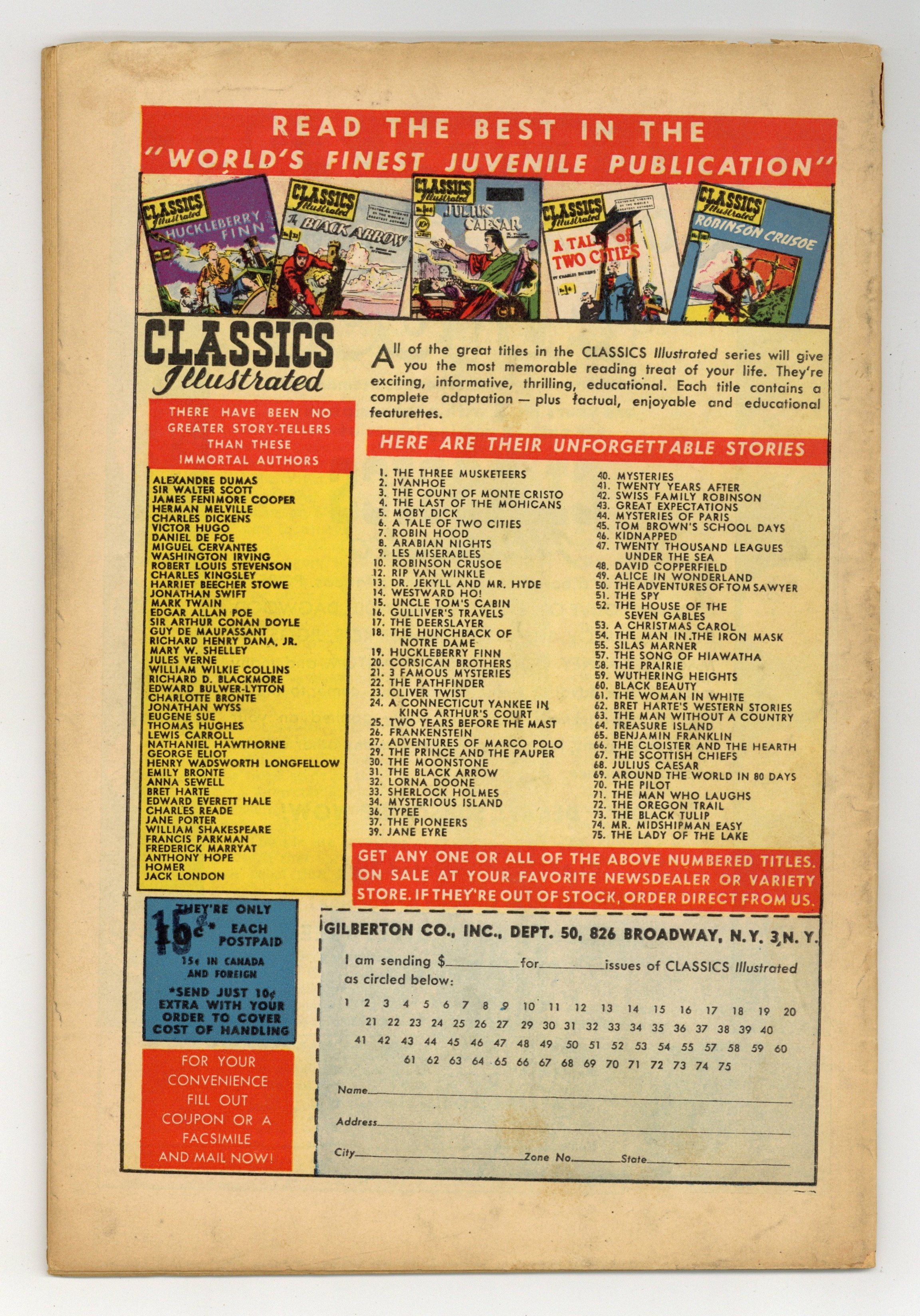 Published Jul 1950 by Classics Illustrated.$35.00- Sticker. 3/4" Spine split from top. Cover oxidation.