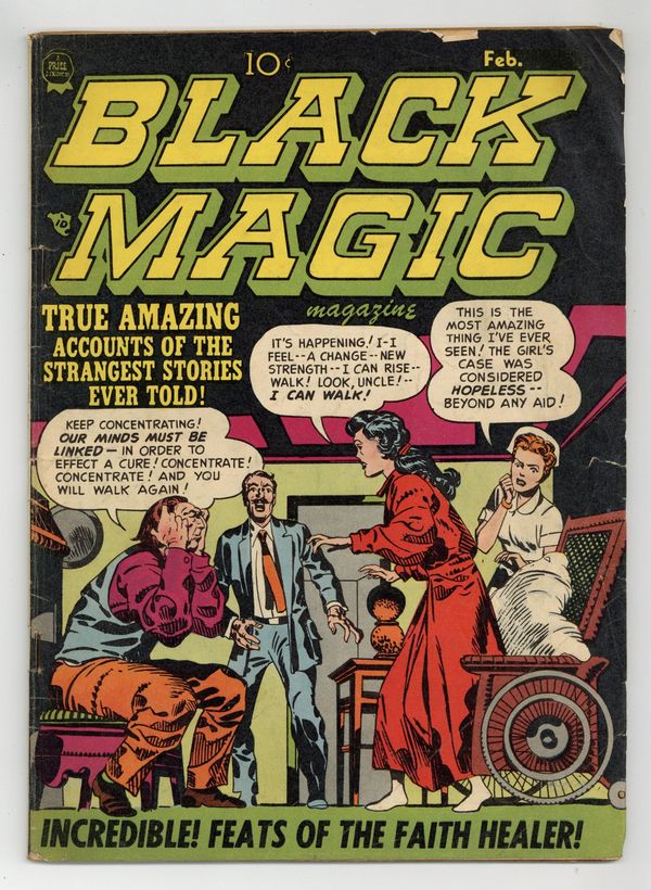 Cover by Jack Kirby. Art by John Prentice, George Roussos, Jerry Grandenetti, Bill Draut, Mort Meskin, and Jack Kirby. Captain America creators Joe Simon and Jack Kirby present their own contribution to the horror comics trend of the 1950s, featuring tales of ghosts and the paranormal. Sometimes listed as Black Magic #9. No issue number listed on cover; listed as Vol. 2, issue #3 in indicia. A woman asks a faith healer to use his powers for murder. A Napoleonic general's death is foretold by his brother's ghost. Ghostly British Crusaders appear to German soldiers on the front during World War I. Faith Healer!; Mark of Evil!; Usnea - Moss of Death!; The Ghost of ChateauBois!; The Man in the Judge's Chair!; A Friend for Billy; The Crusaders in No Man's Land!; You Should Live So Long! 44 pages, Full Color (GCD has inaccurate page count --Autumn). Cover price $0.10.
