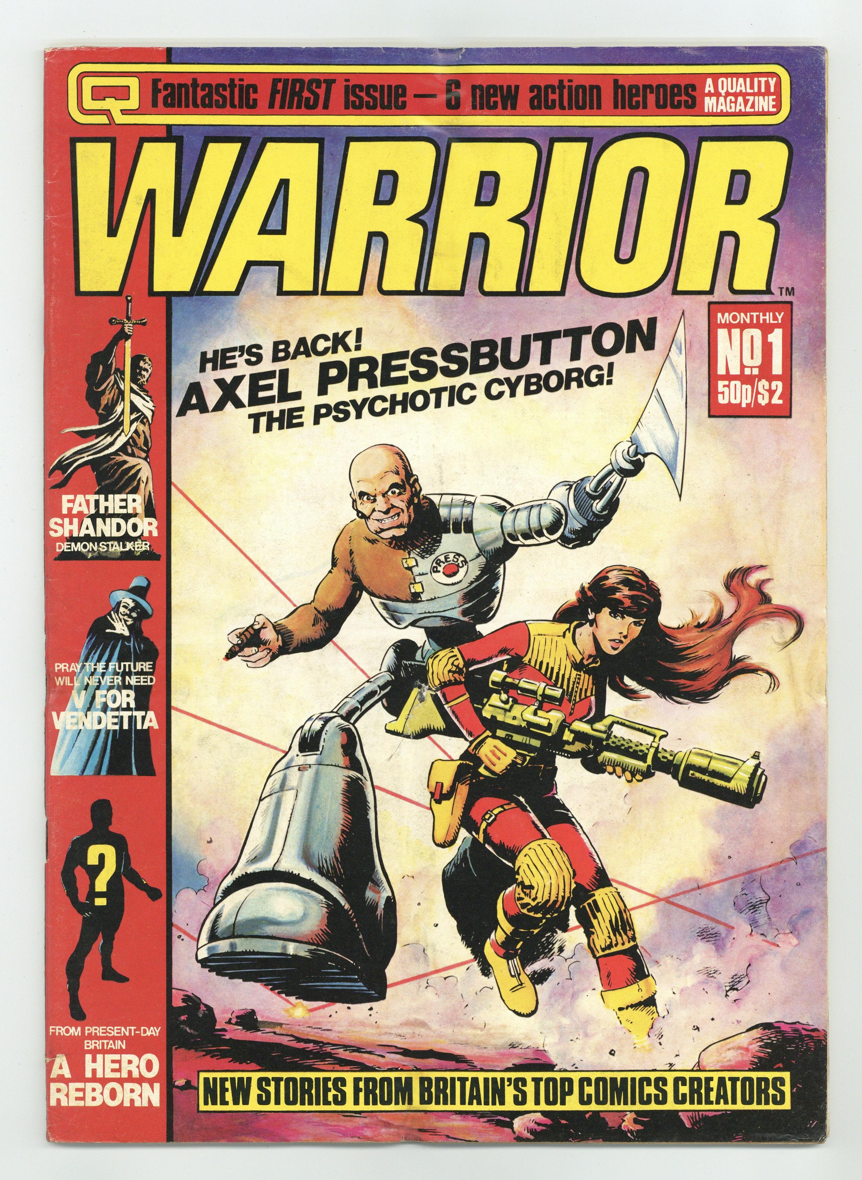 Published Mar 1982 by Quality Communications Lt.$120.00Here it is, the UK comic anthology magazine that started it all. Back in 1982, Warrior hit the newsstands featuring some of the best and brightest of Britain's comic talent, including the first appearance of Alan Moore's MarvelMan, who eventually becomes Miracleman in the U.S. Axel Pressbutton cover by Steve Dillon; "A Dream of Flying" (Marvelman) by Alan Moore & Garry Leach; "The Mightiest Man in the Universe" by Dez Skinn. A look back at Marvelman; "The Spiral Path" by Steve Parkhouse; "A True Story" by Steve Moore and Dave Gibbons; "The Legend of Prester John" by Steve Moore & John Bolton; "V for Vendetta" by Alan Moore and David Lloyd; "Father Shandor, Demon Stalker" by Steve Moore & John Bolton; "Laser Eraser & Pressbutton" by Pedro Henry & Steve Dillon; "Warriors All" a look at the creative talent from this issue. Cover price $2.00.